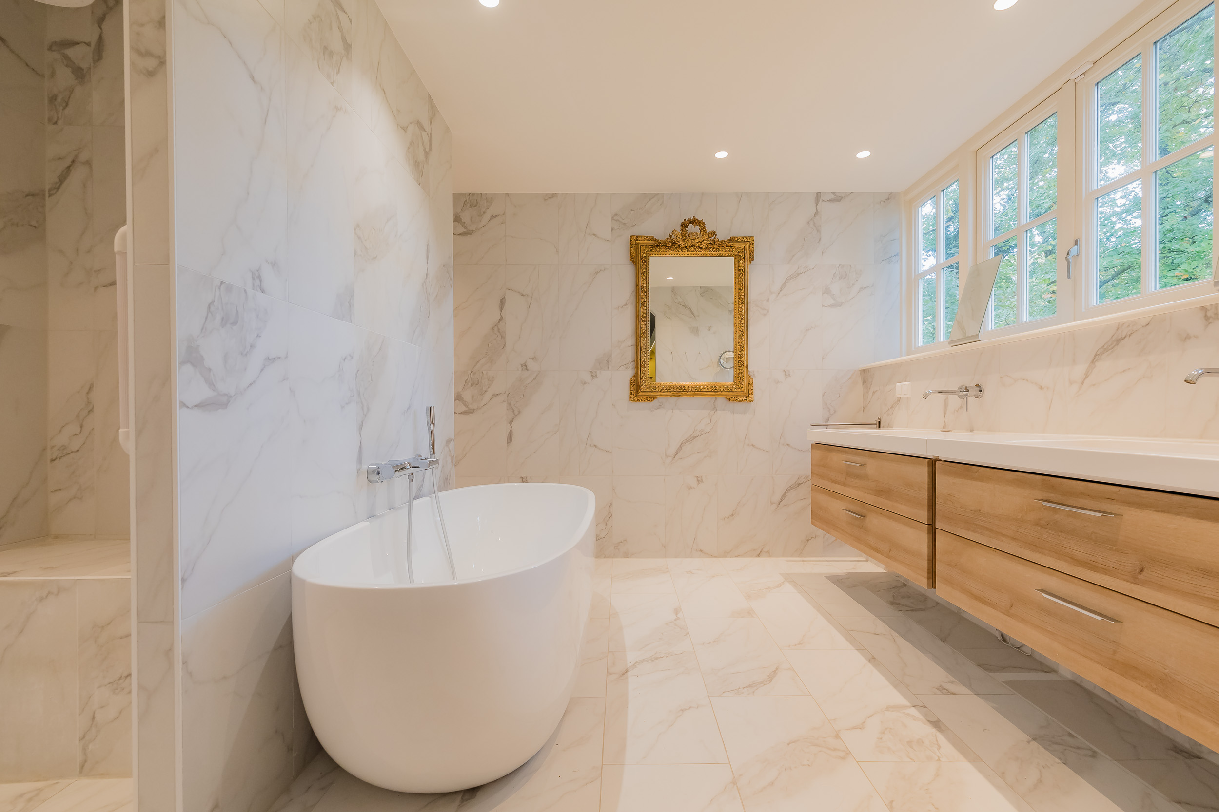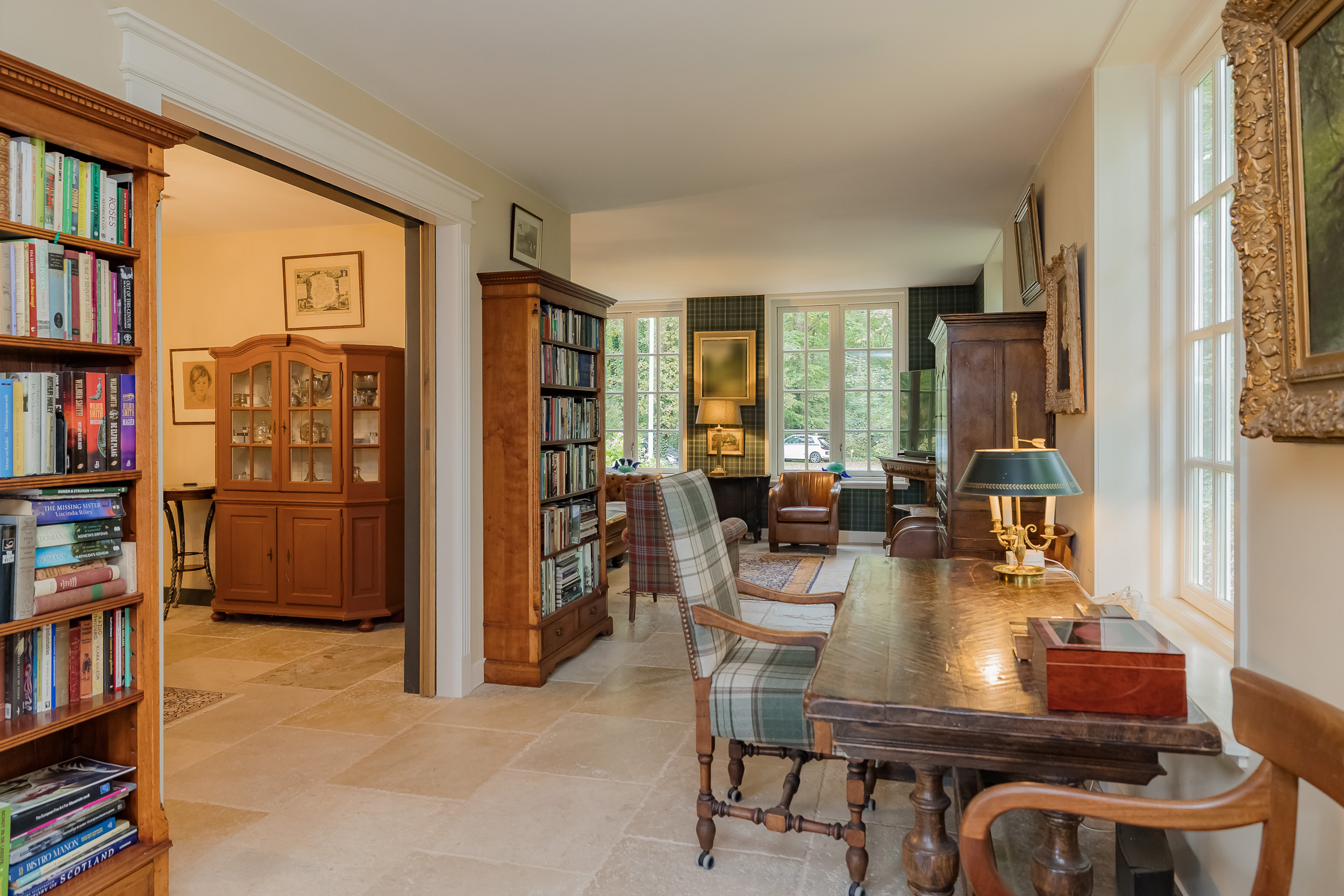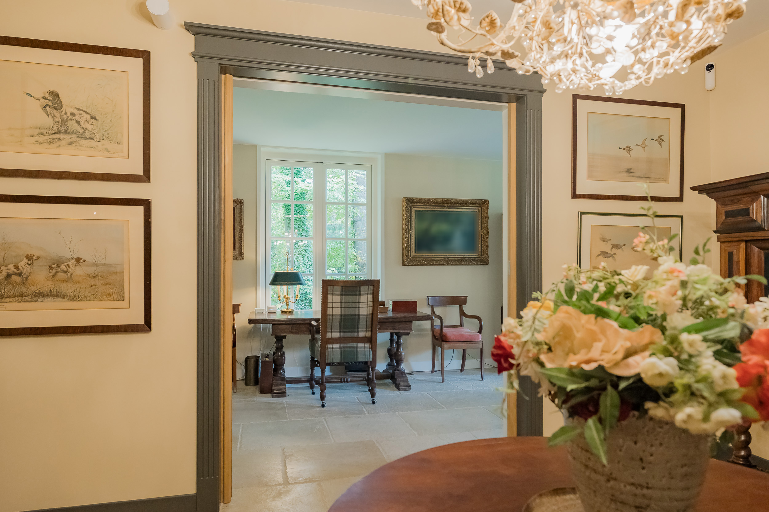 Via de indrukwekkende centrale hal met fraaie bordestrap en lift bereikt u alle vertrekken. De lichte woonkamer is een heerlijke ruime plek om van de rust en het uitzicht te genieten en biedt direct toegang tot de veranda. De open haard en de vloerverwarming zorgen voor nog meer sfeer en comfort. Aan de voorzijde van de woning bevindt zich een sfeervolle herenkamer (of eetkamer) met uitzicht op het bos. Tussen deze kamers in bevindt zich een ruime werkplek.