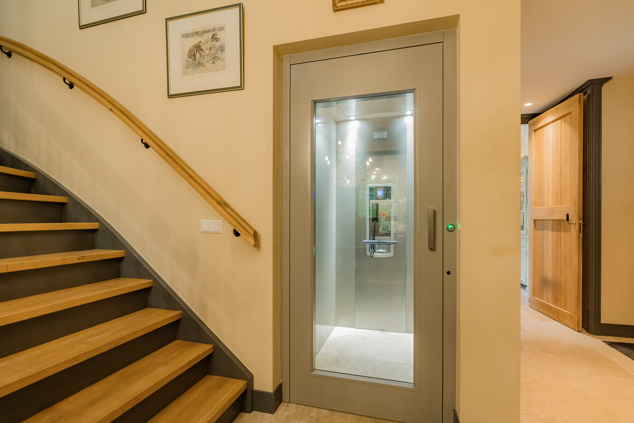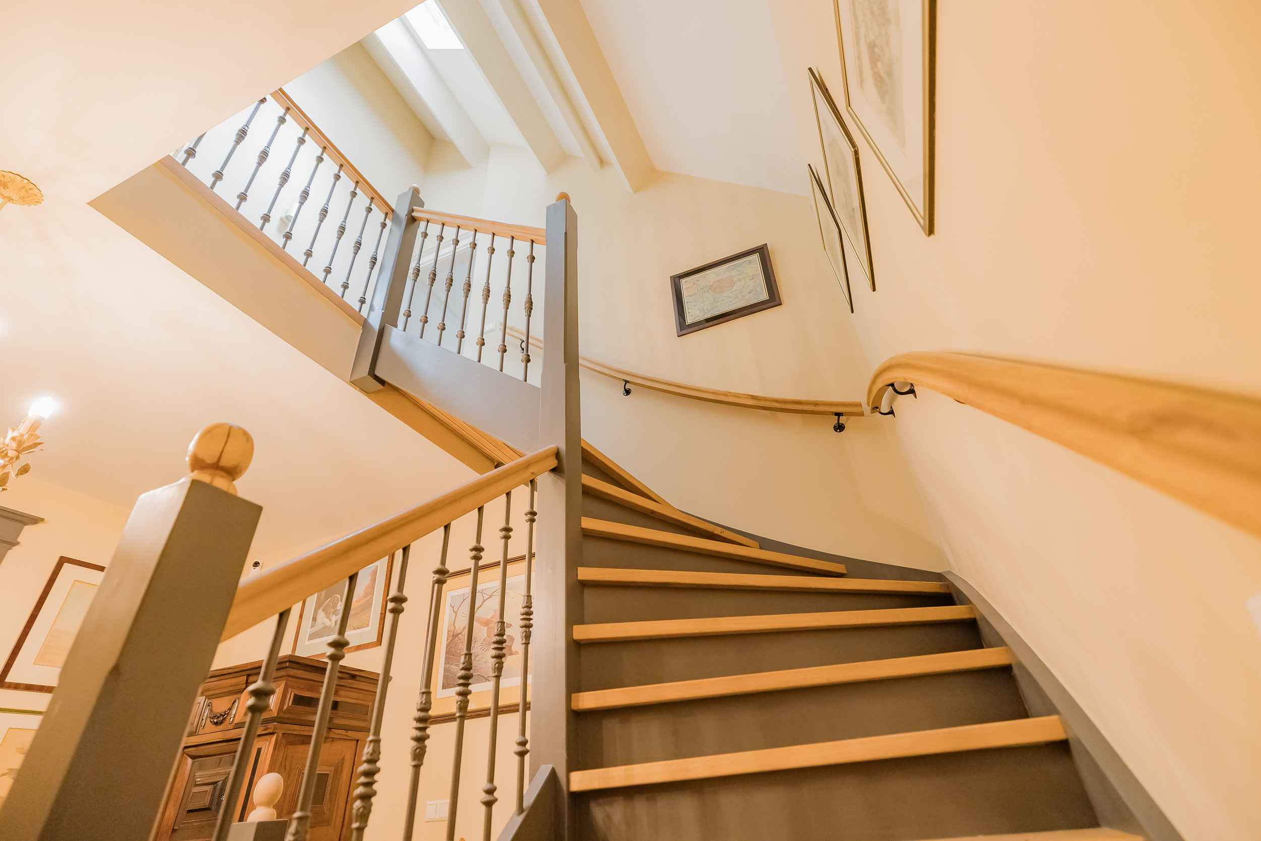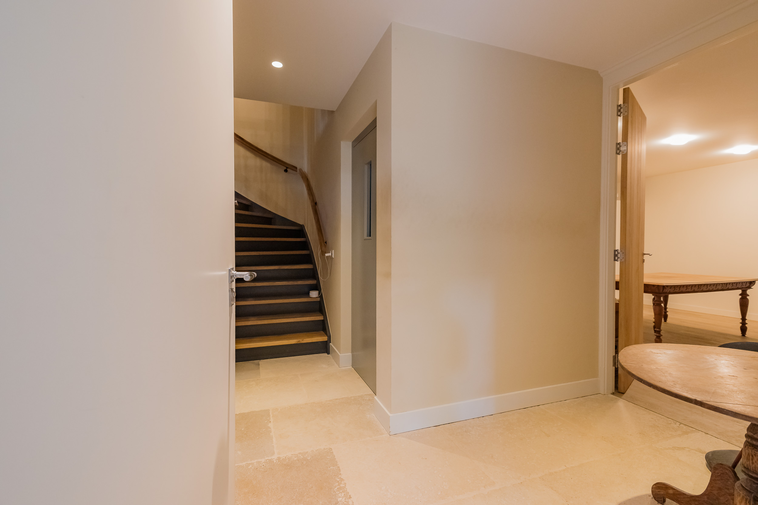 Via de indrukwekkende centrale hal met fraaie bordestrap en lift bereikt u alle vertrekken. De lichte woonkamer is een heerlijke ruime plek om van de rust en het uitzicht te genieten en biedt direct toegang tot de veranda. De open haard en vloerverwarming zorgen samen voor nog meer sfeer en comfort. Aan de voorzijde van de woning bevindt zich een sfeervolle herenkamer (of eetkamer) met uitzicht op het bos. Tussen deze kamers in bevindt zich een ruime werkplek.