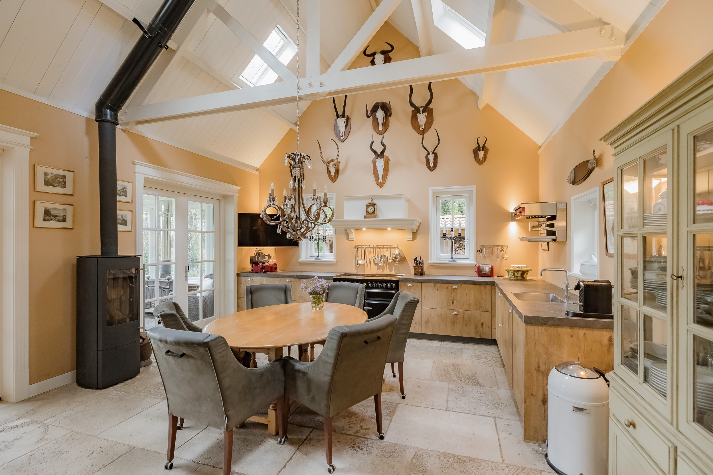 De royale, sfeervolle woonkeuken heeft een hoog plafond, een entresol, moderne inbouwapparatuur waaronder een Amerikaanse koelkast en een luxe AGA inductiefornuis met 4 ovens. Aansluitend is er een praktische bijkeuken. De dakramen en de houtkachel maken de keuken tot een fijne, warme plek om te koken en te eten. Vanuit de keuken loopt u zo de veranda op, waar een houtkachel ervoor zorgt dat u het hele jaar kunt genieten van het buitenleven.
