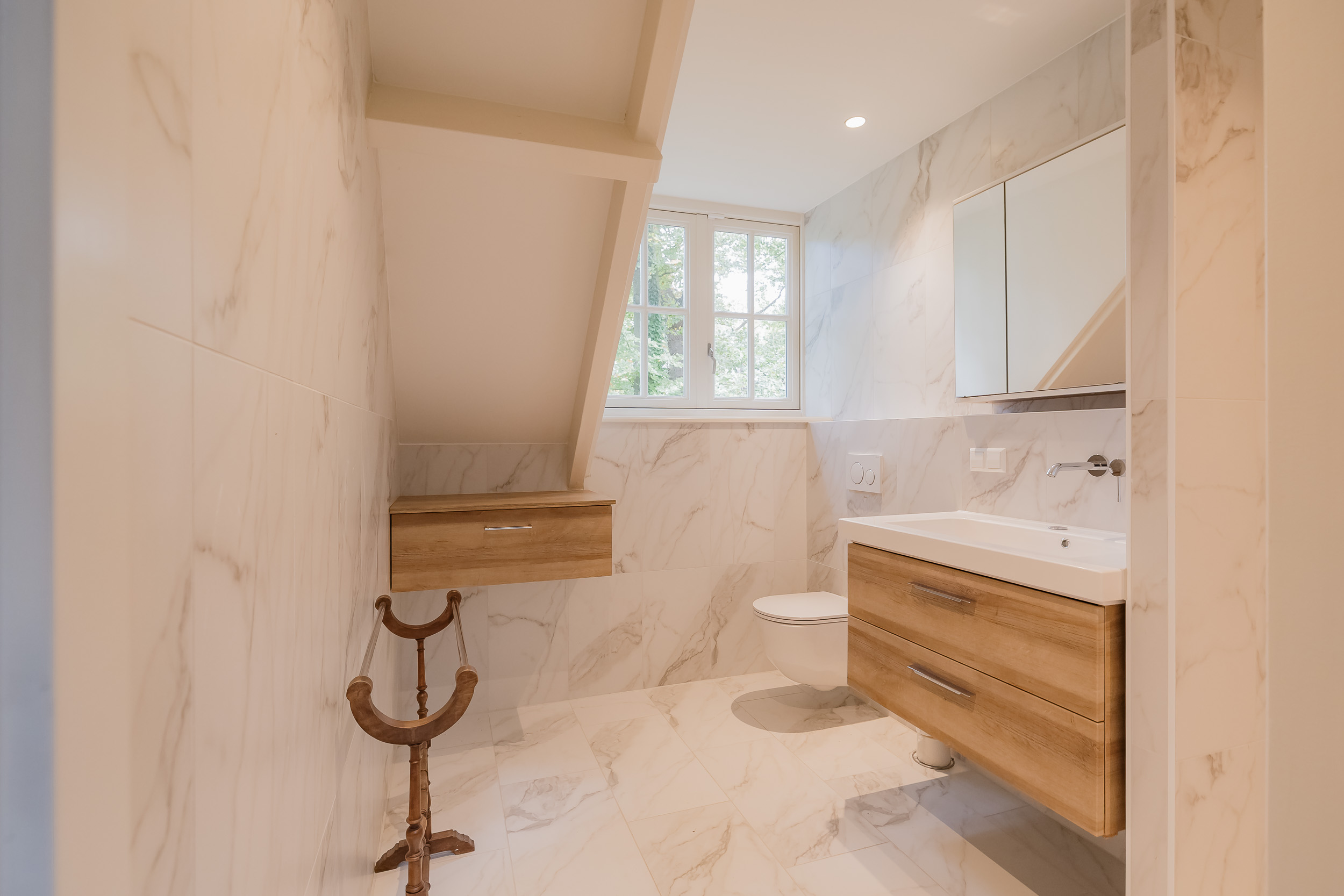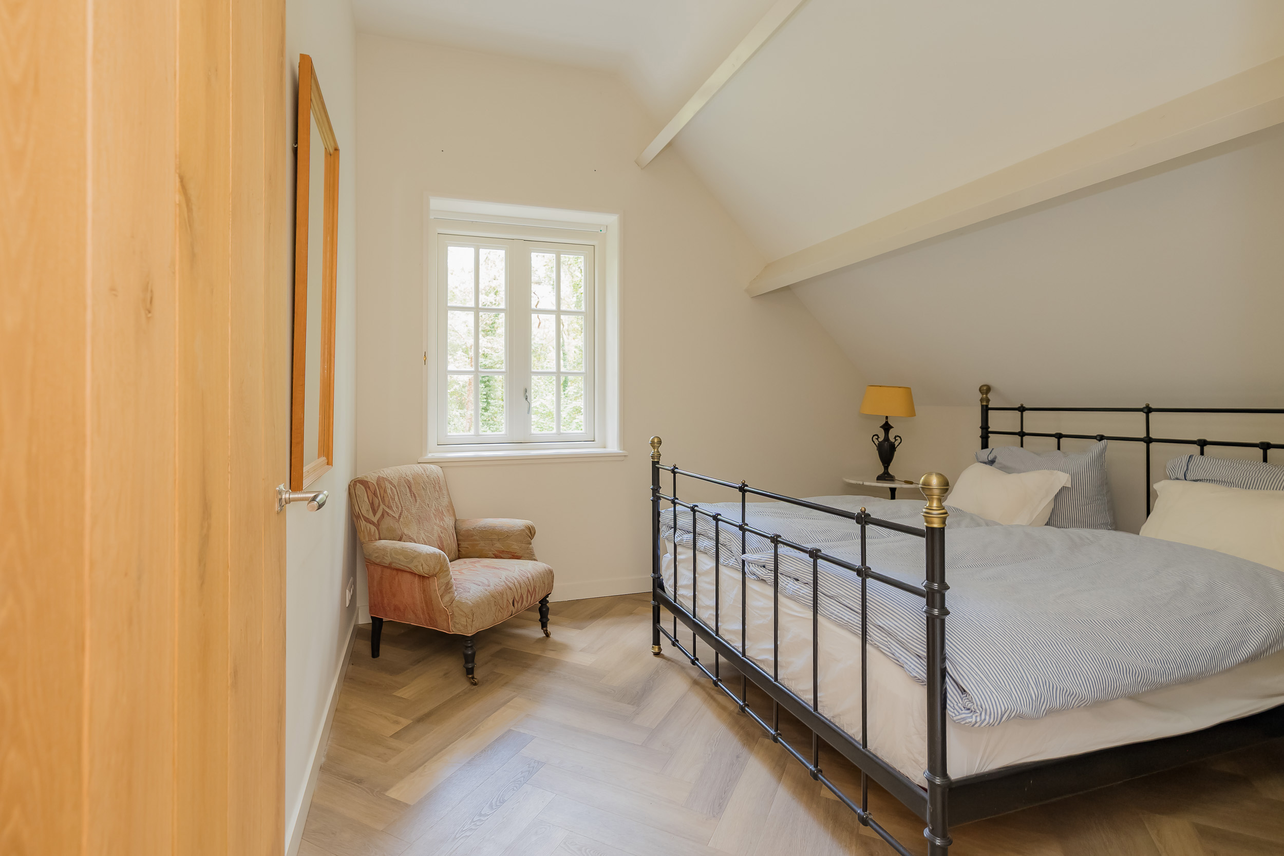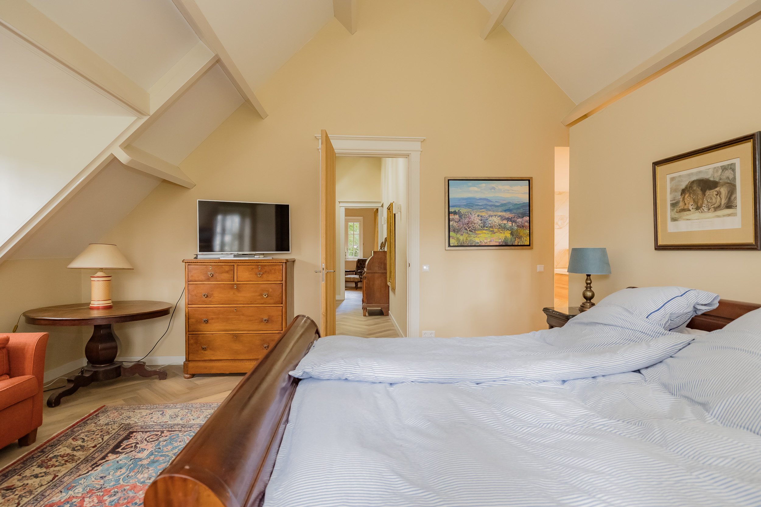 De bovenverdieping heeft een ruime overloop met dakramen voor extra licht. De royale hoofdslaapkamer beschikt over een slim geplaatste kleedkamer en een eigen luxe badkamer met ligbad, inloopdouche, groot wastafelmeubel, een toilet en een urinoir. Daarnaast zijn er nog twee ruime slaapkamers en een tweede badkamer, perfect voor gezin of gasten. Via de overloop is de entresol bereikbaar welke ook gebruikt kan worden als logeerkamer en dakkapellen zorgen op de verdieping voor extra ruimte en lichtinval. Bovendien is er nog een vliering.