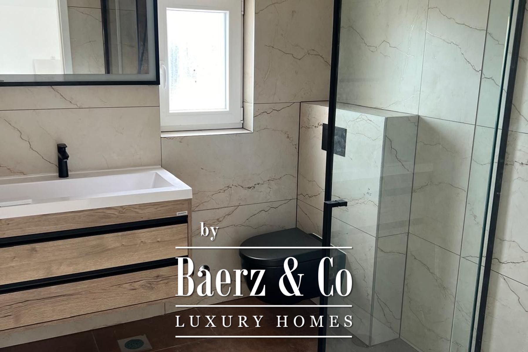 Op de eerste verdieping delen twee slaapkamers een badkamer, terwijl de master suite over een eigen badkamer beschikt en toegang biedt tot een ruim terras met uitzicht op de tuin. Innovatieve technologieën zoals zonneverwarming, een warmtepomp en airconditioning in iedere kamer garanderen comfort in elk seizoen. Een buitenkeuken met barbecue, oplaadpunt voor elektrische auto's en parkeergelegenheid voor drie voertuigen sluiten naadloos aan op het moderne dagelijks leven.