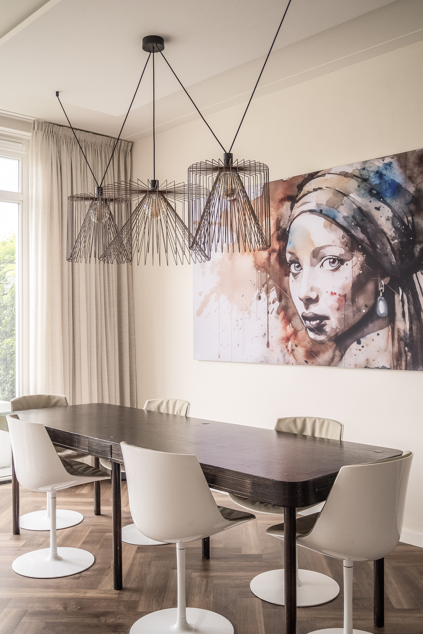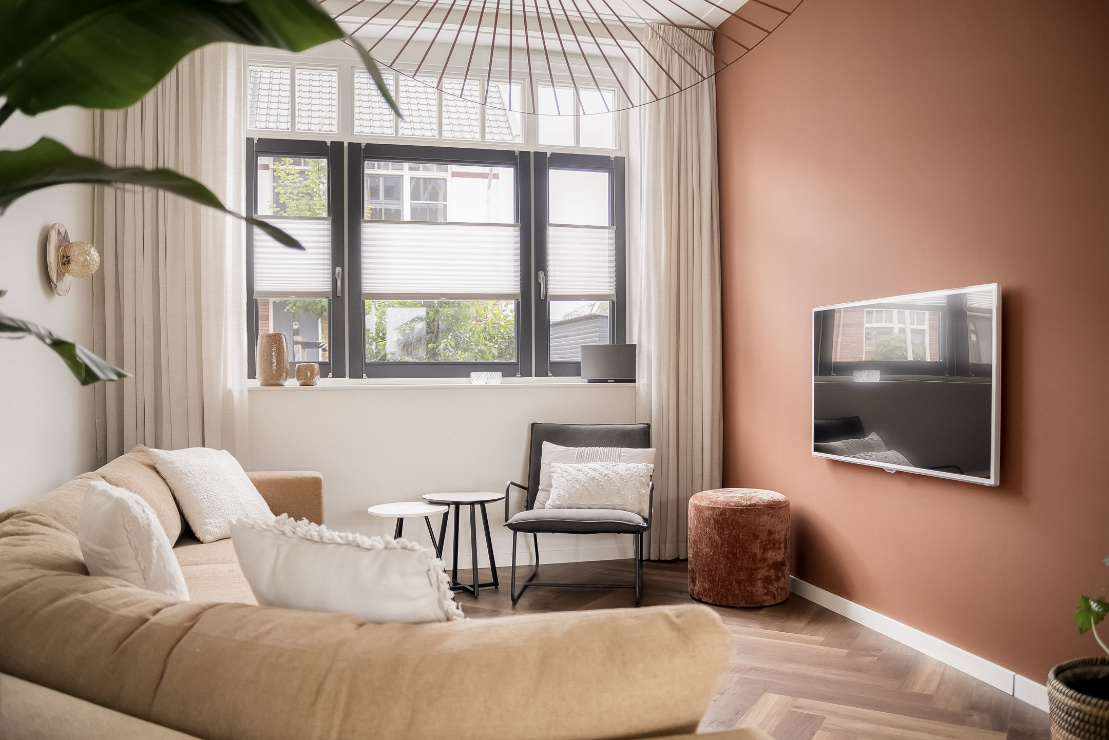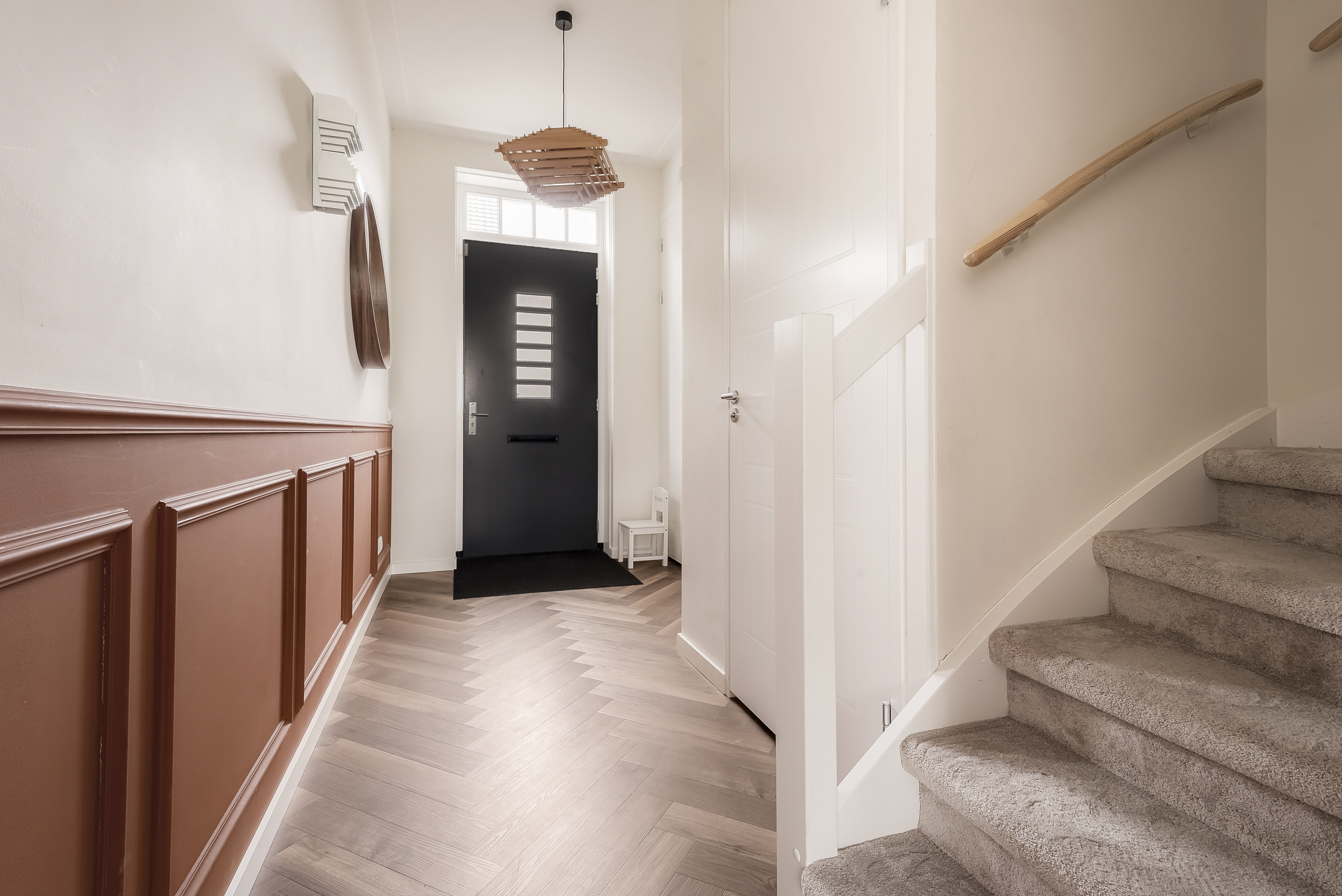 De entreehal met stijlvolle lambrisering, een modern toiletruimte en meterkast geeft toegang tot de lichte woonkamer en open woonkeuken. Aan de voorzijde van de woning bevindt zich de sfeervolle woonkamer.