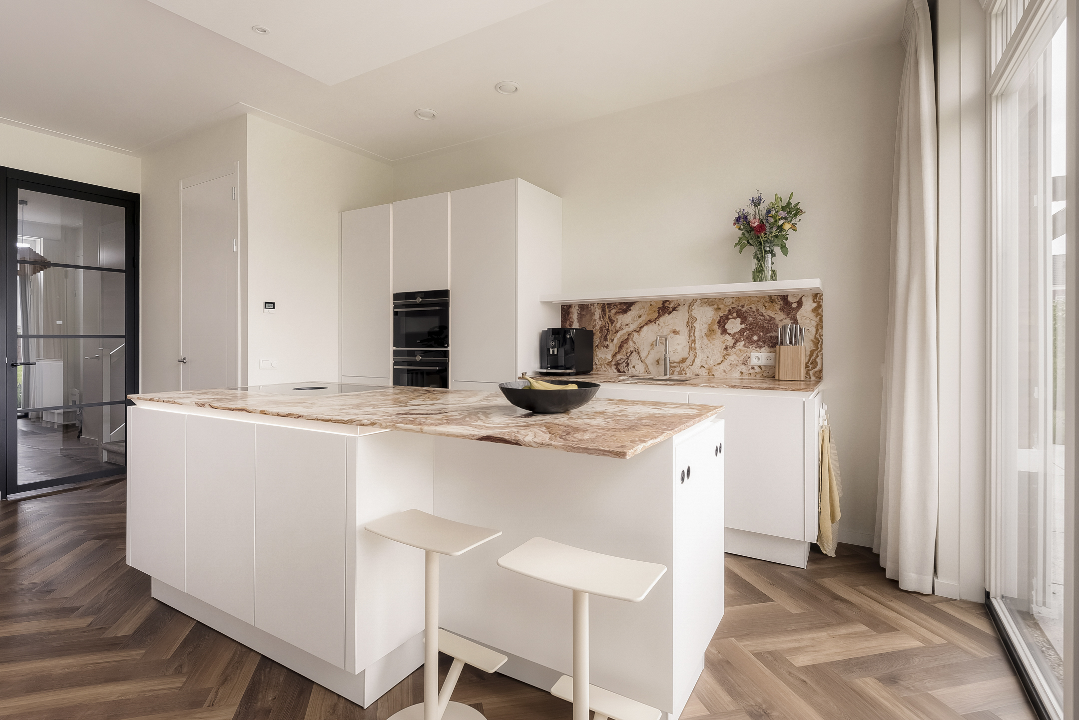 De luxe Siematic keuken aan de achterzijde is perfect voor culinaire liefhebbers. Deze is uitgerust met een inductiekookplaat met Bora afzuigsysteem, hoogwaardige Onyx natuurstenen werkbladen en apparaten van Siemens Studioline (zoals een combi-oven, stoomoven, hete lucht oven, koel-/vriescombinatie, vaatwasser en een Quooker inclusief Cube uitbreiding). Het geheel is afgewerkt met ledverlichting en biedt volop kastruimte. Openslaande deuren met roedeverdeling verbinden de woonkeuken met de riante en zonnige achtertuin gelegen op het zuidwesten. De ruimte achter de berging kan worden uitgebouwd en bij de woonkamer worden betrokken.