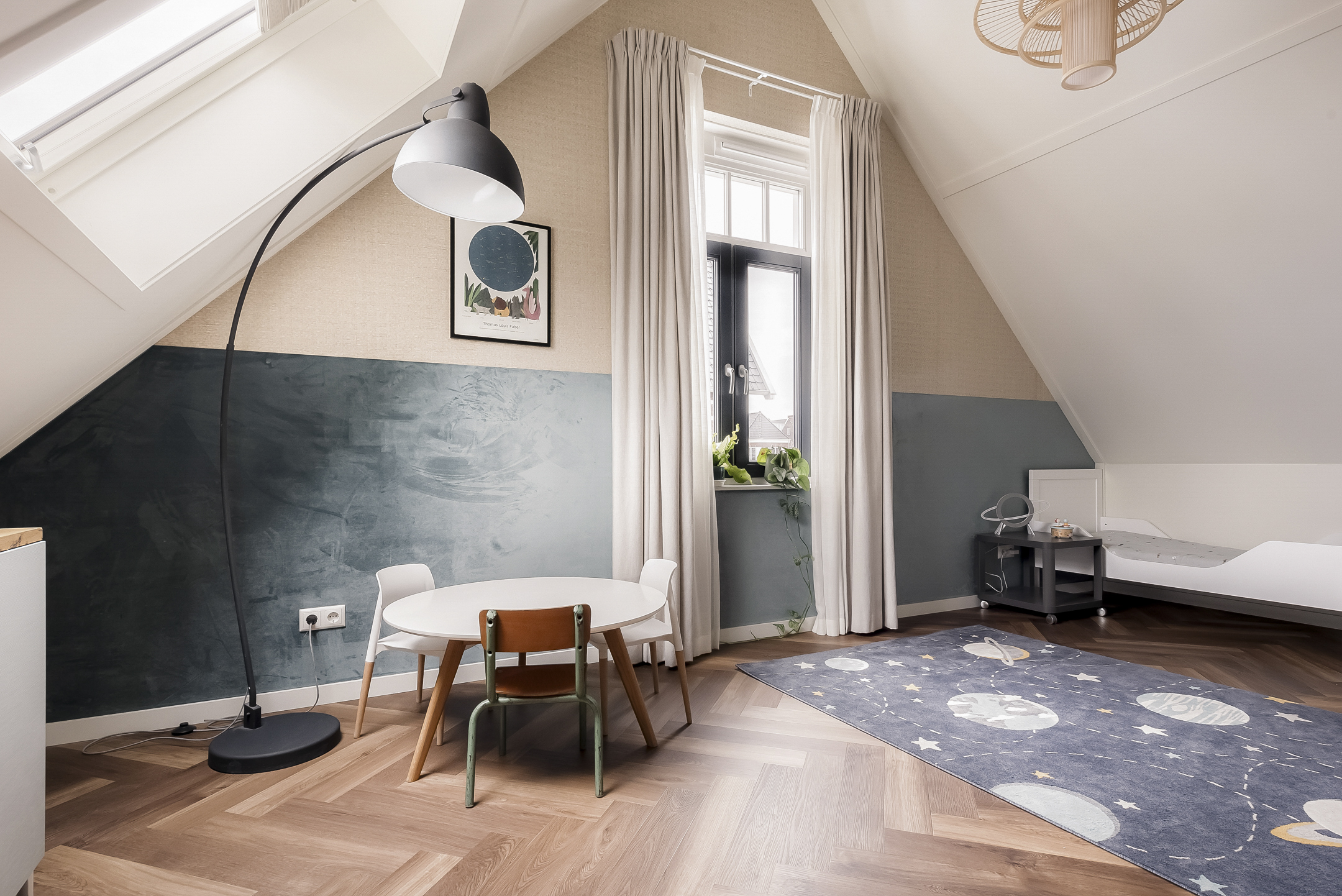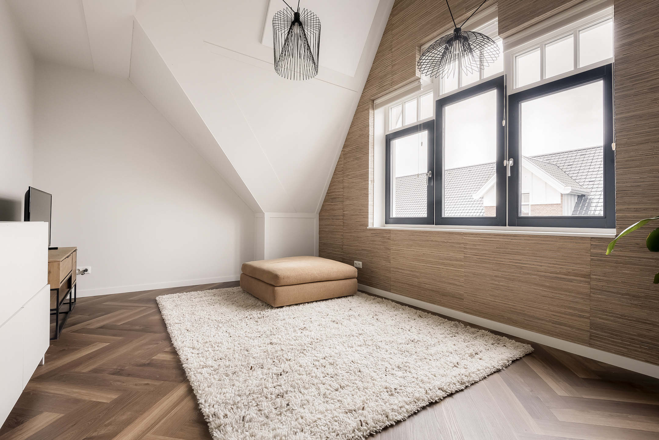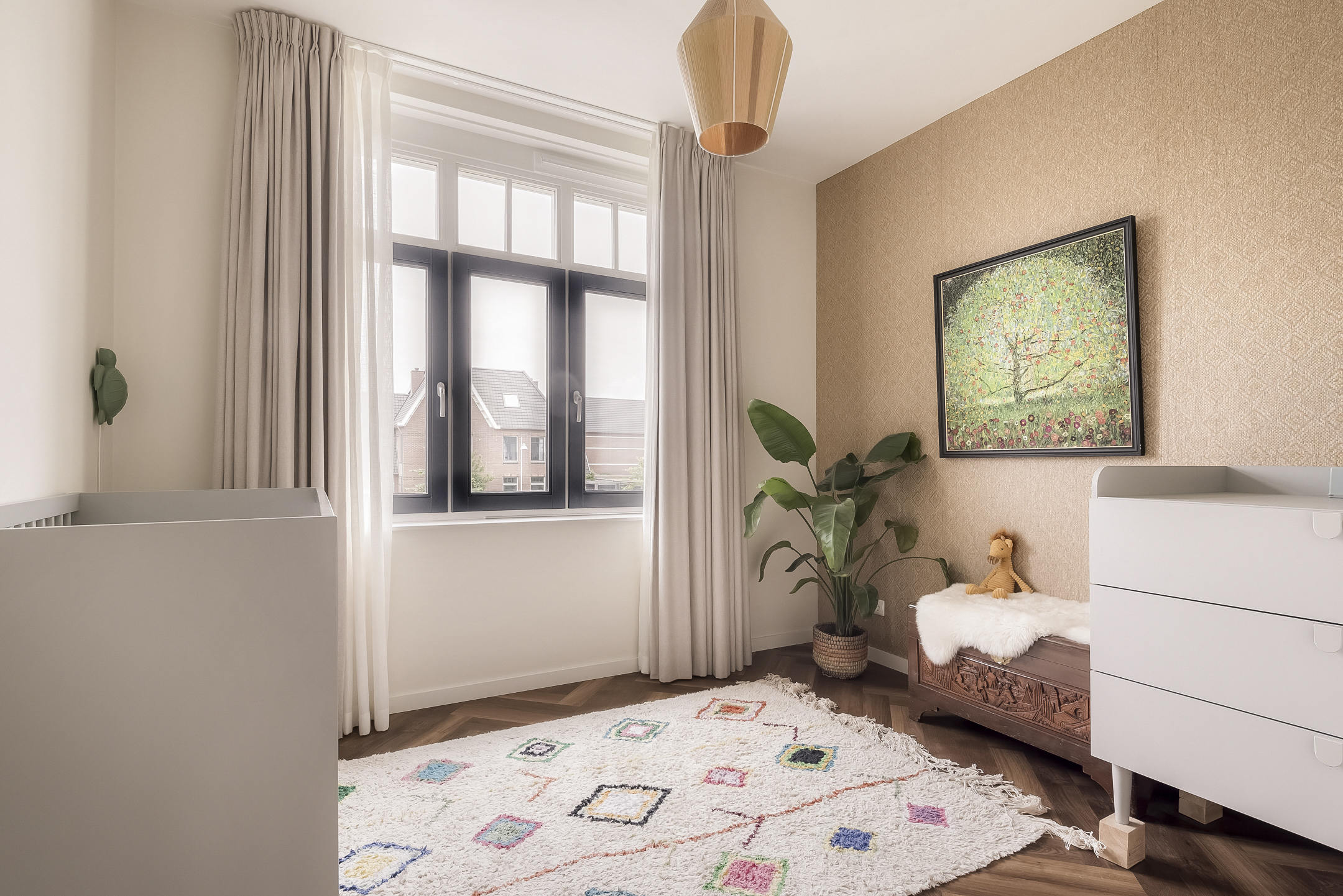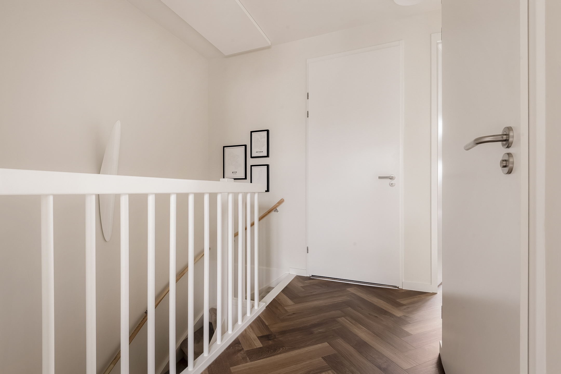 Op de eerste verdieping bevinden zich vier slaapkamers en een ruime badkamer. De kamer aan de voorzijde heeft een walk-in closet. Een tweede grote slaapkamer bevindt zich boven de berging en is voorzien van een Velux dakraam met zonwering en een zijraam met roedeverdeling. De twee slaapkamers aan de achterzijde zijn ideaal voor kinderen, gasten of een kantoor aan huis.