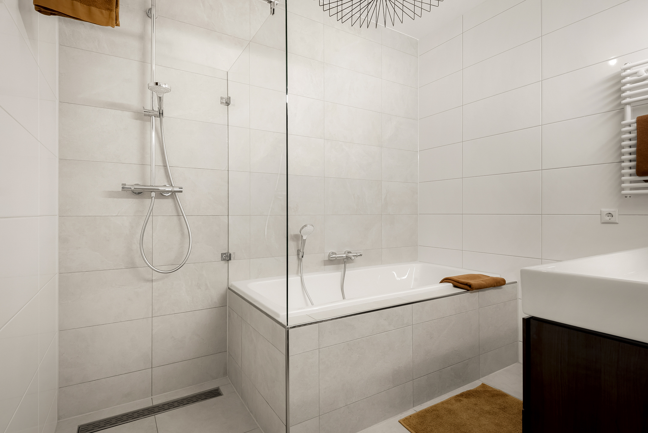 De badkamer straalt luxe uit, met een inloopdouche met draingoot, ligbad, een stijlvolle wastafel in meubel met spiegelkast en een handdoekradiator. Ook deze verdieping is voorzien van een PVC-vloer en heeft een separate toiletruimte met wandcloset.