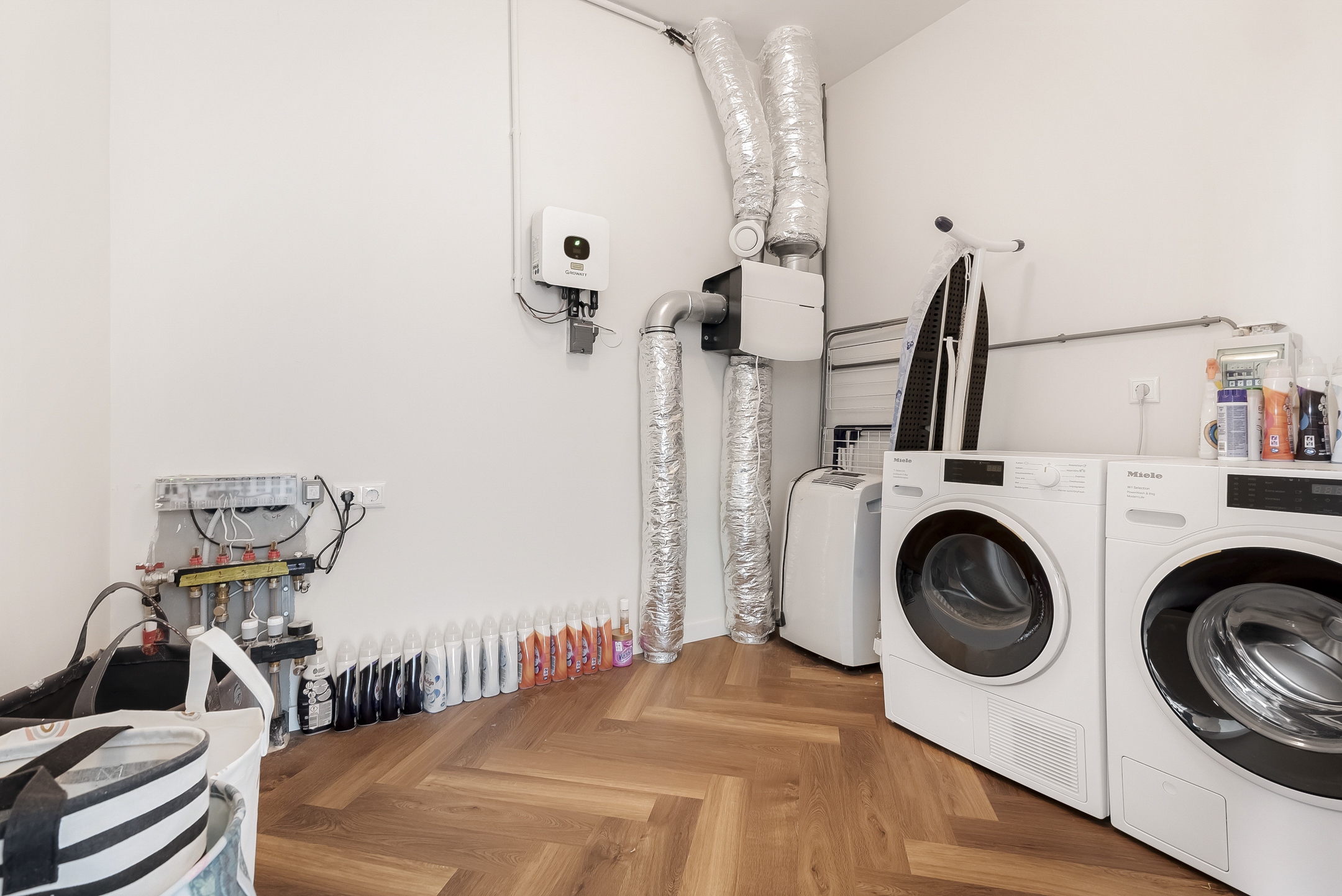 De technische ruimte is ingericht met aansluitingen voor een wasmachine en droger, een ventilatiebox en de omvormer van de 15 zonnepanelen. De gehele verdieping, inclusief overloop en slaapkamers, is afgewerkt met een PVC-vloer.