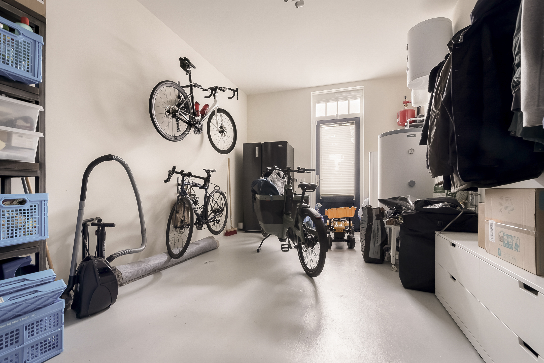 Bij aankomst valt direct de ruime voortuin op, met een eigen oprit die plek biedt aan twee auto's. De verwarmde en geïsoleerde berging, bereikbaar via dubbele deuren, biedt tal van mogelijkheden, zoals opslag of het creëren van een werk- of hobbyruimte. Vanuit de berging, waar ook de warmtepomp en boiler voor warm water zijn geplaatst, is er directe toegang tot zowel de woning als de achtertuin. Deze ruimte kan eventueel worden uitgebouwd.