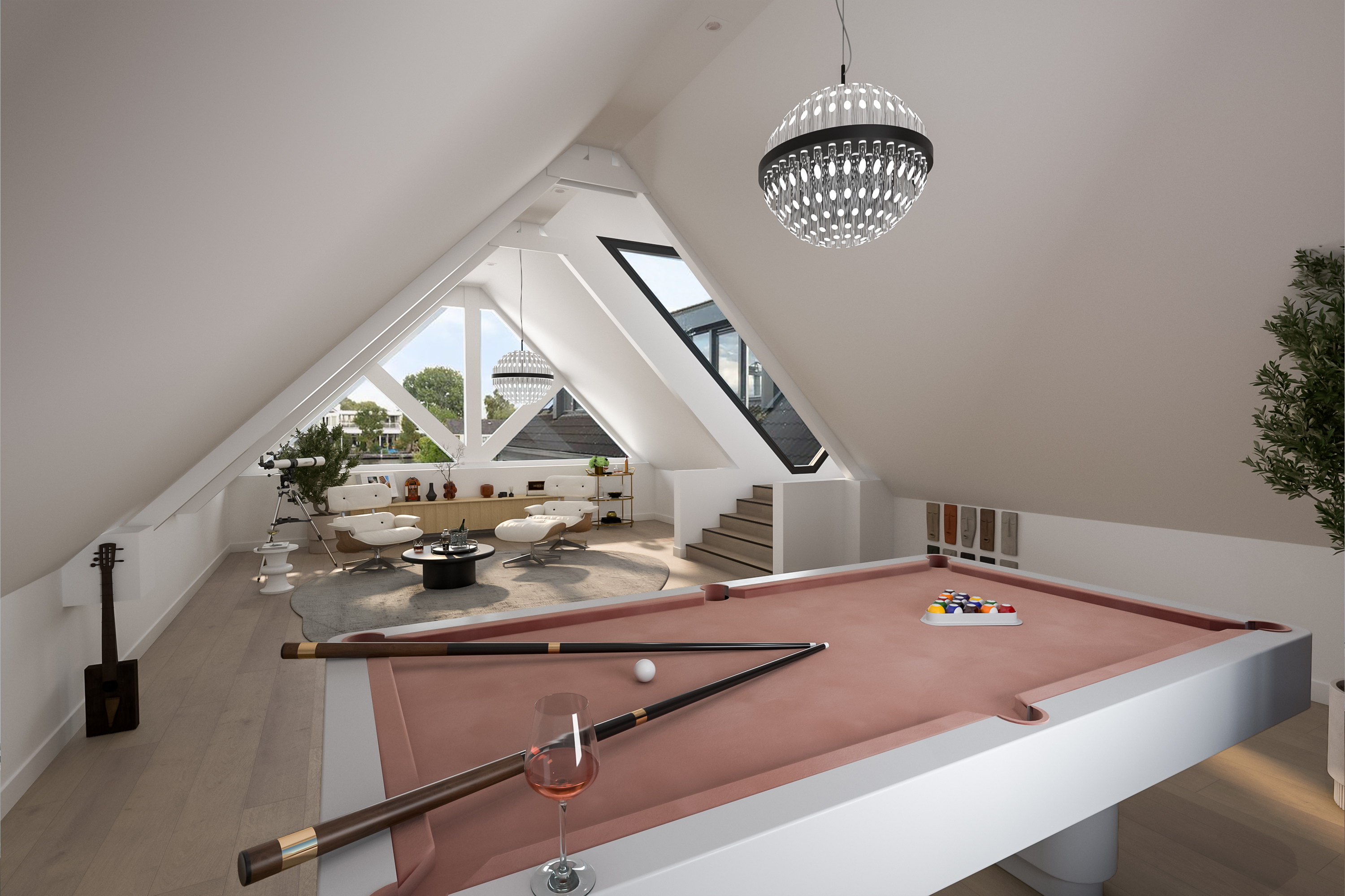 Aan de linkerzijde, direct grenzend aan het boothuis, bevinden zich twee royale kamers. Eén daarvan is voorbereid voor een thuisbioscoop ,de aansluitingen zijn reeds aanwezig. Terwijl de andere ruimte zich uitstekend leent als kantoor of hobbykamer.