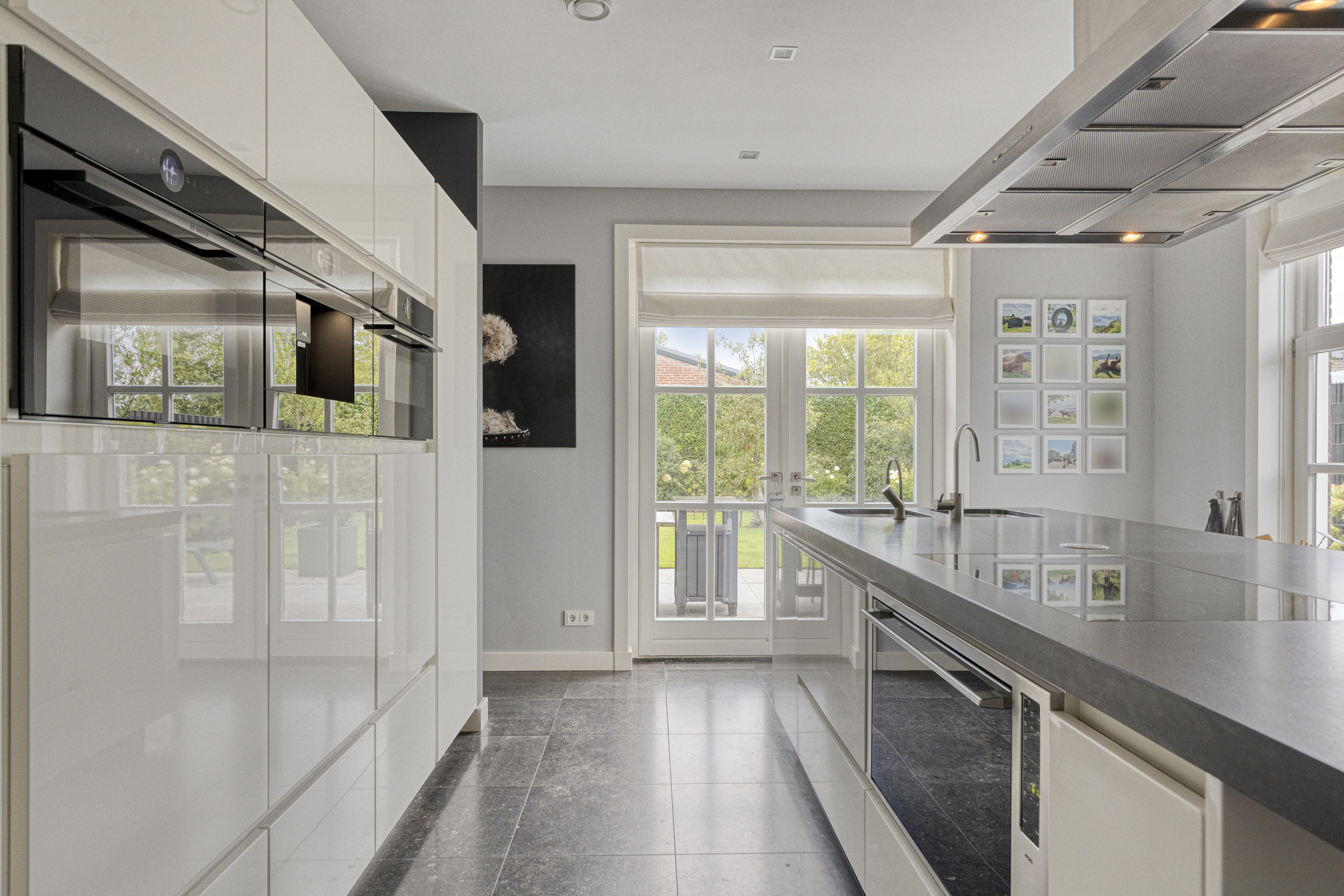 Woonkeuken: moderne Bosch/Miele?inbouwapparatuur met kook-/spoel-eiland en geïntegreerde eettafel; composiet werkblad met dubbele spoelbak en Quooker; Miele inductiekookplaat met Miele afzuigschouw; kastenwand met Bosch inbouw koffiemachine, Bosch koelkast (met freshzone), Bosch vriezer, 2x Bosch combi?oven/magnetron, ATAG elektrische oven (90 cm), Miele vaatwasser op ergonomische hoogte.