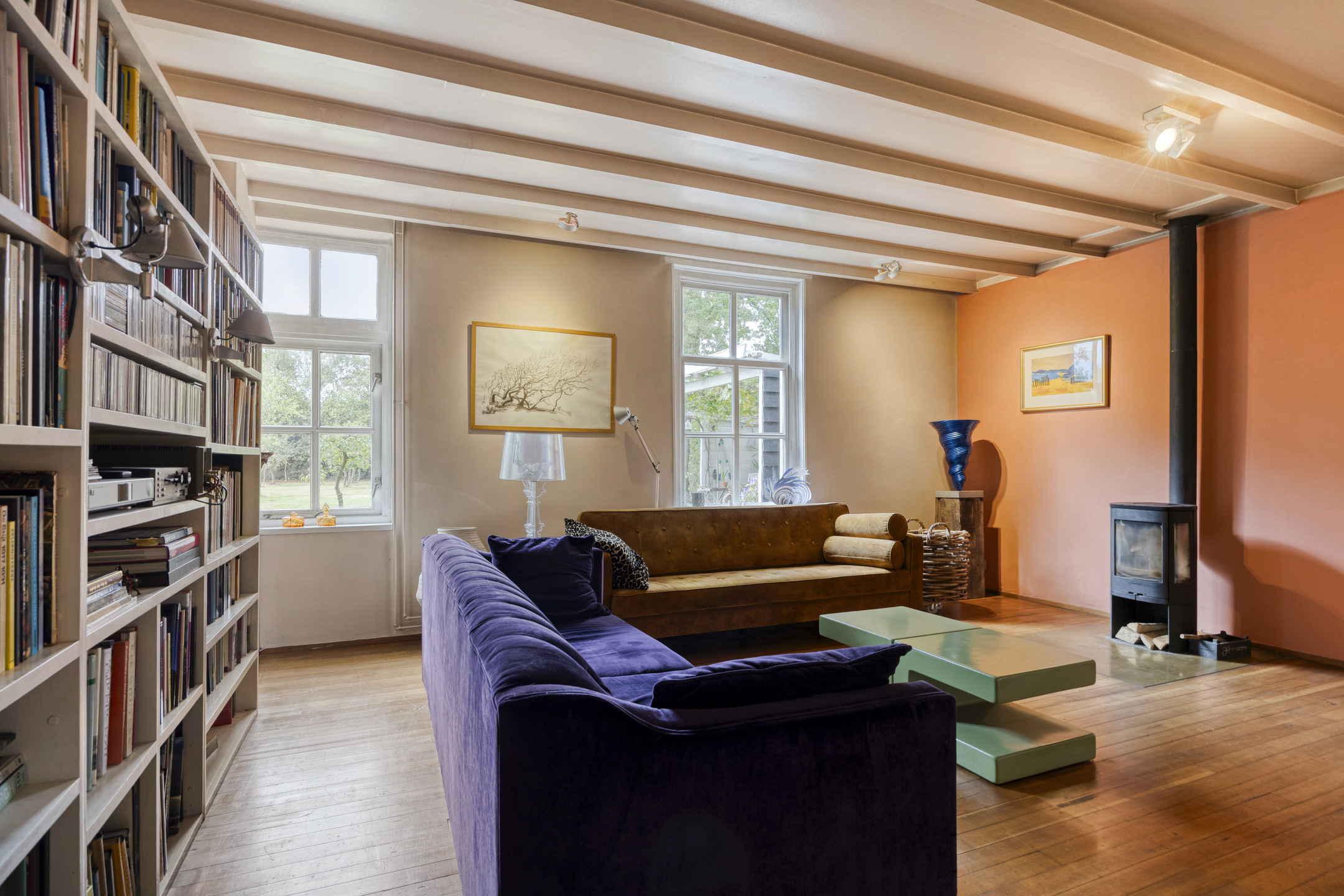 woonkamer voorzien van een houthaard met dubbelwandig doorvoer, wandafwerking stucwerk, massief houten vloer op tegelvloer (kloostervloer), balkenplafond;