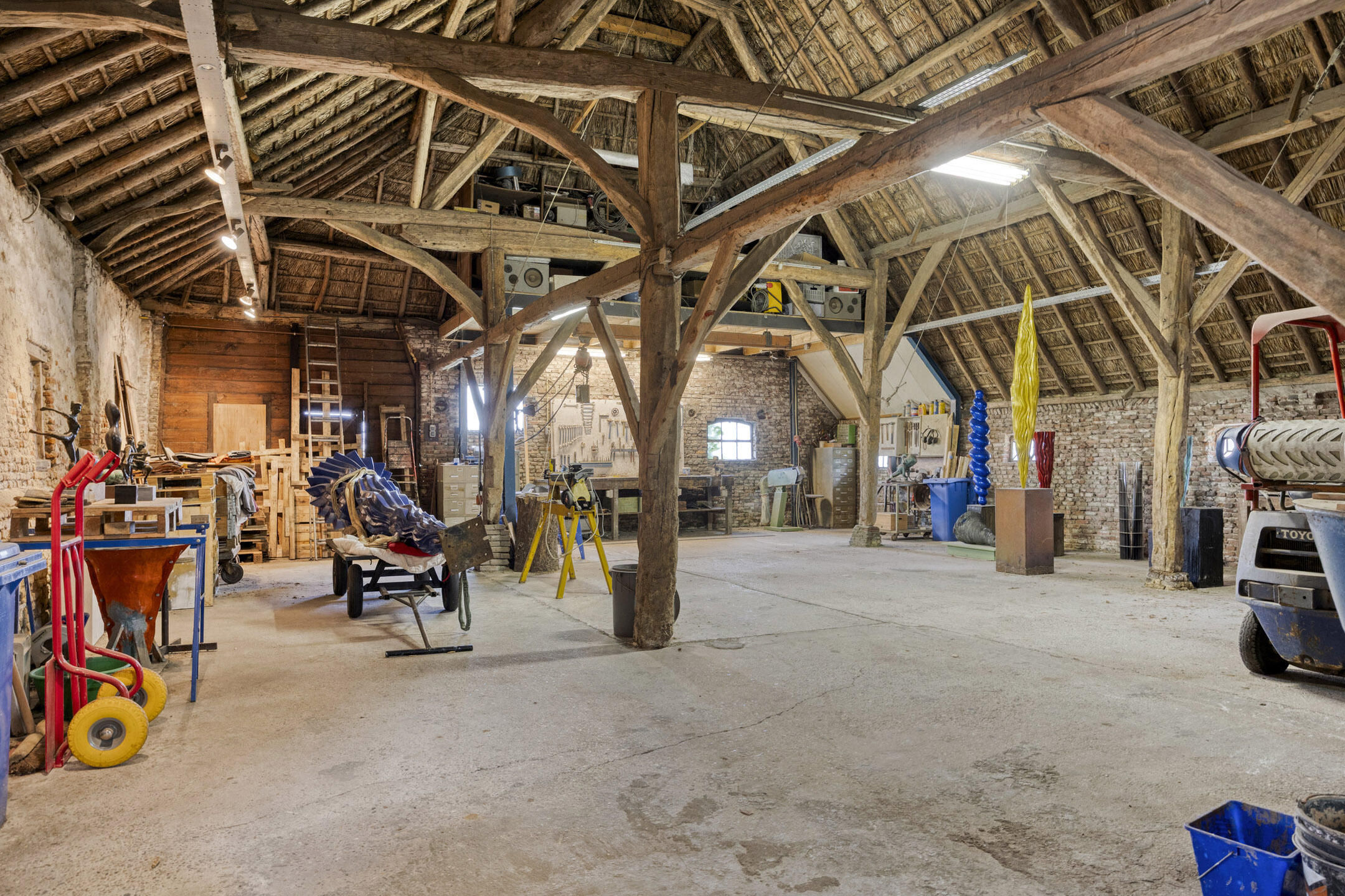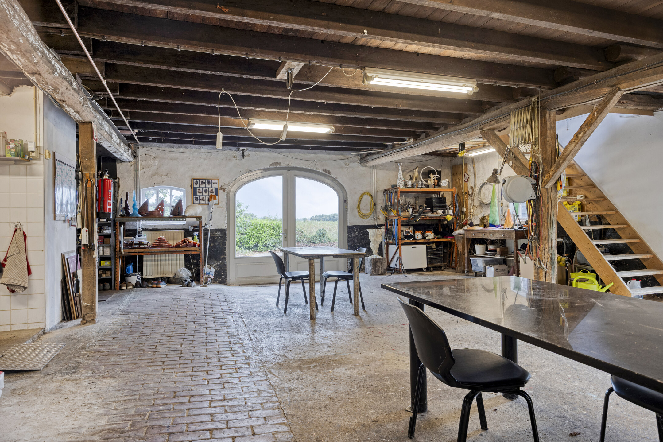 inpandig atelier als gesitueerd aan de voorzijde van de woonboerderij (ca. 87 m²), multifunctioneel in te richten / te gebruiken voor meerdere doeleinden, voorzien een keukenblok, een 2e trap naar de 1e verdieping, tuindeuren naar tuin/terras, loopdeur naar oprit, wandafwerking stucwerk, betonvloer en deels bestrating, balkenplafond.