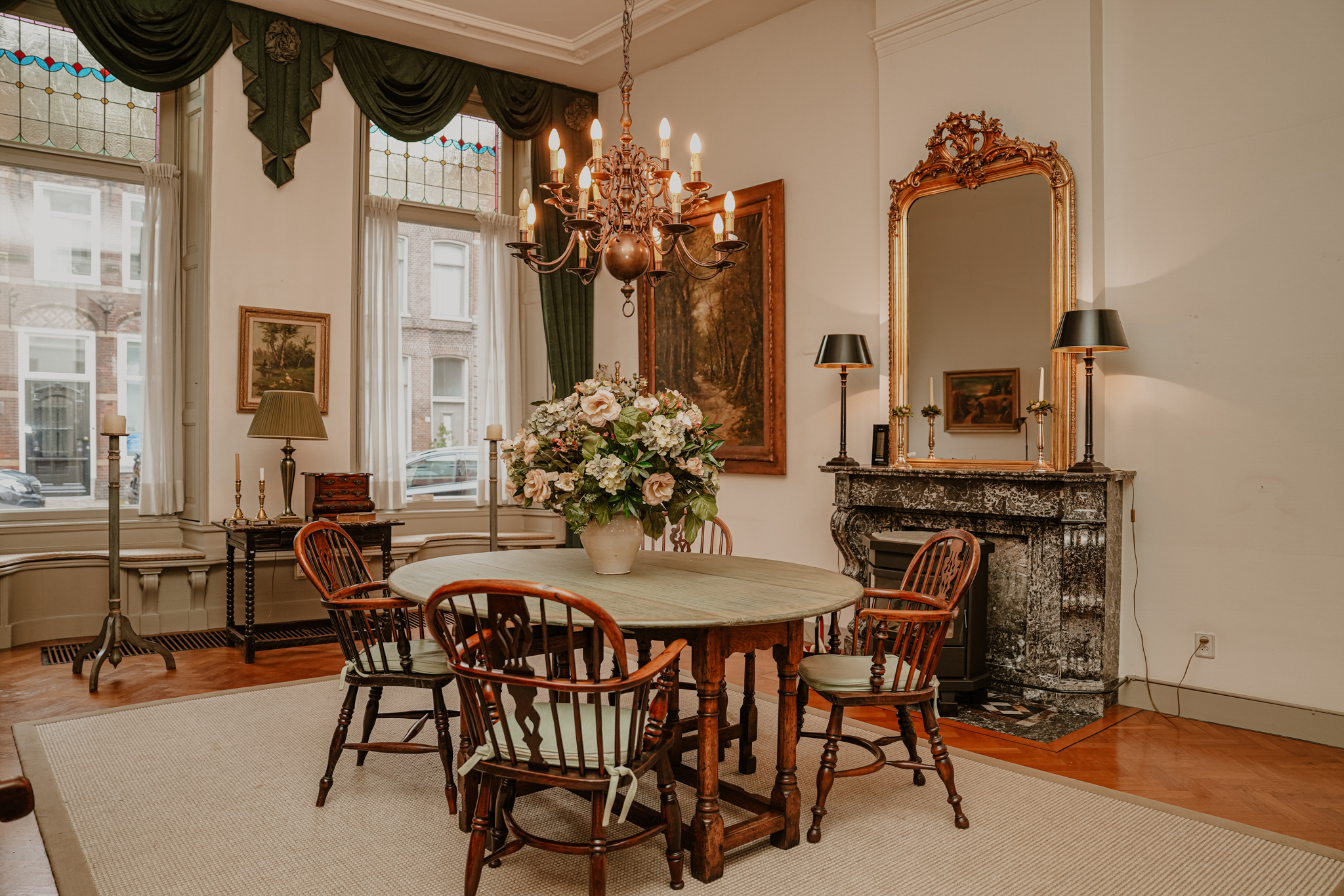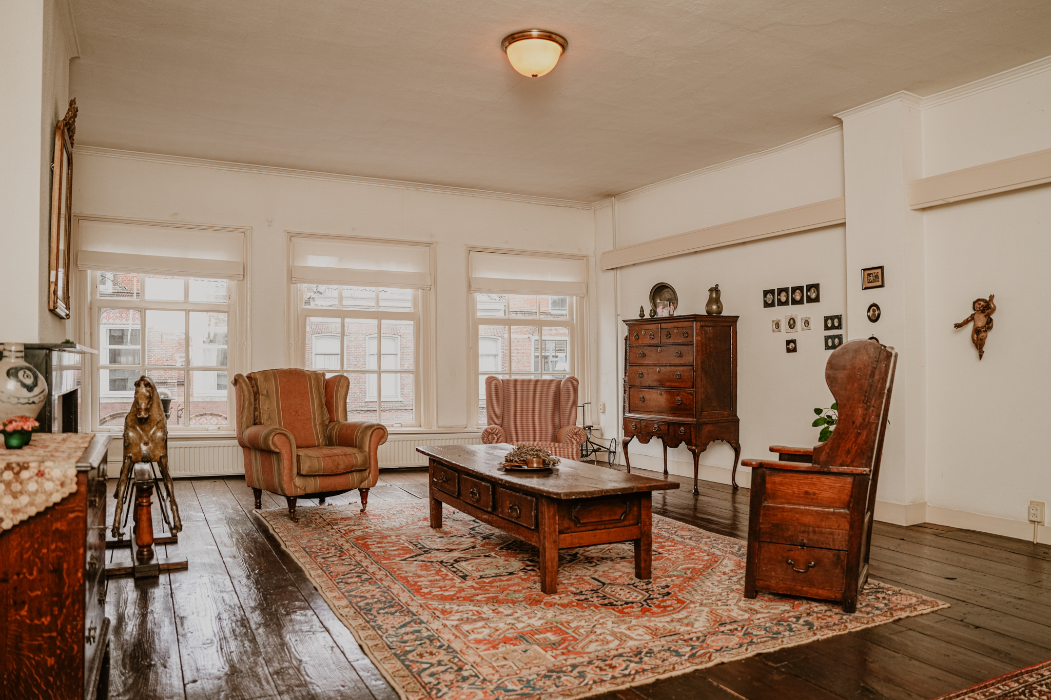 De woonkamer heeft hoge stucplafonds, hoge vensters met glas-in-lood bovenlichten, twee natuurstenen schouwen, zitvensterbanken, binnenluiken, vaste kasten en visgraatparket. Aan de achterzijde geven twee paar dubbele deuren toegang tot de tuin. Aan de eerdergenoemde gang grenzen een kelder, de bijkeuken en de eetkeuken. In de vloer van de kelder biedt een glasplaat zicht op de historische waterput. De bijkeuken bevindt zich op de plaats waar vroeger de buitenruimte van de westelijke woning was in de tijd dat het nog twee panden waren. In de gang zijn de 18e-eeuwse pomp met hardstenen spoelbak en koperen kranen nog aanwezig. De eetkeuken is ingericht met een klassiek keukenmeubel voorzien van enige inbouwapparatuur en een terrazzo-werkblad. Vanuit de keuken is zicht op de tuin.