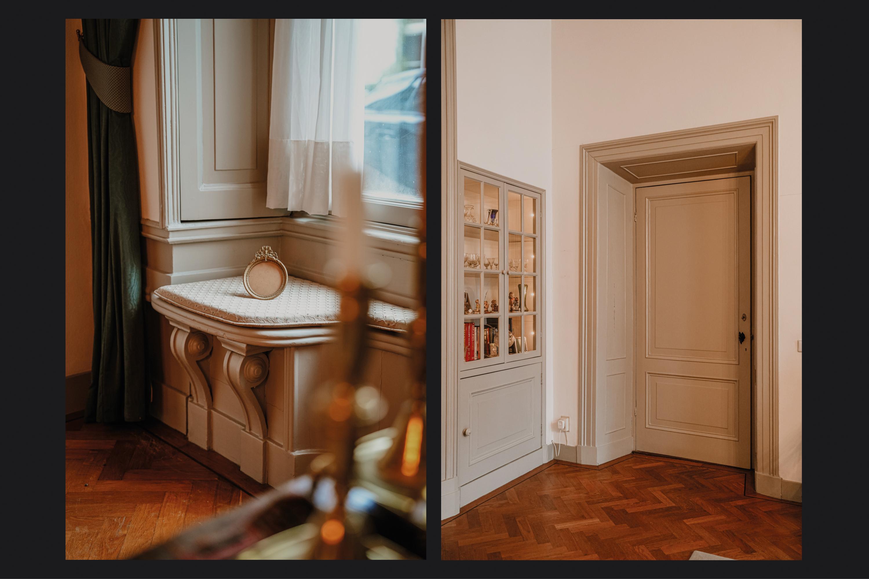 Imposante entree met het formaat van een doorsnee woonkamer. Er ligt een marmeren vloer die in de aangrenzende gang overgaat in een hardstenen vloer. Aan de linkerzijde bevindt zich de woonkamer en suite van maar liefst 70 m2.