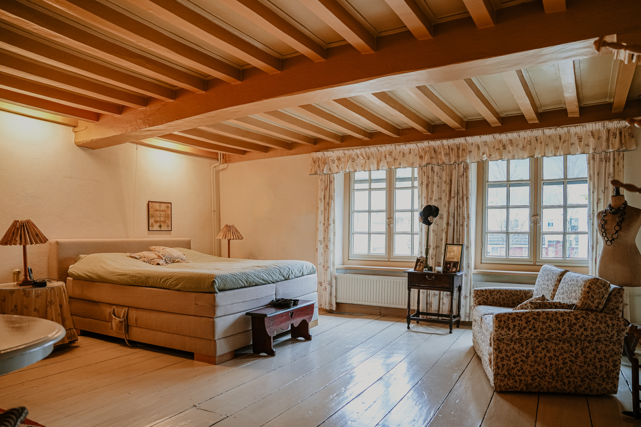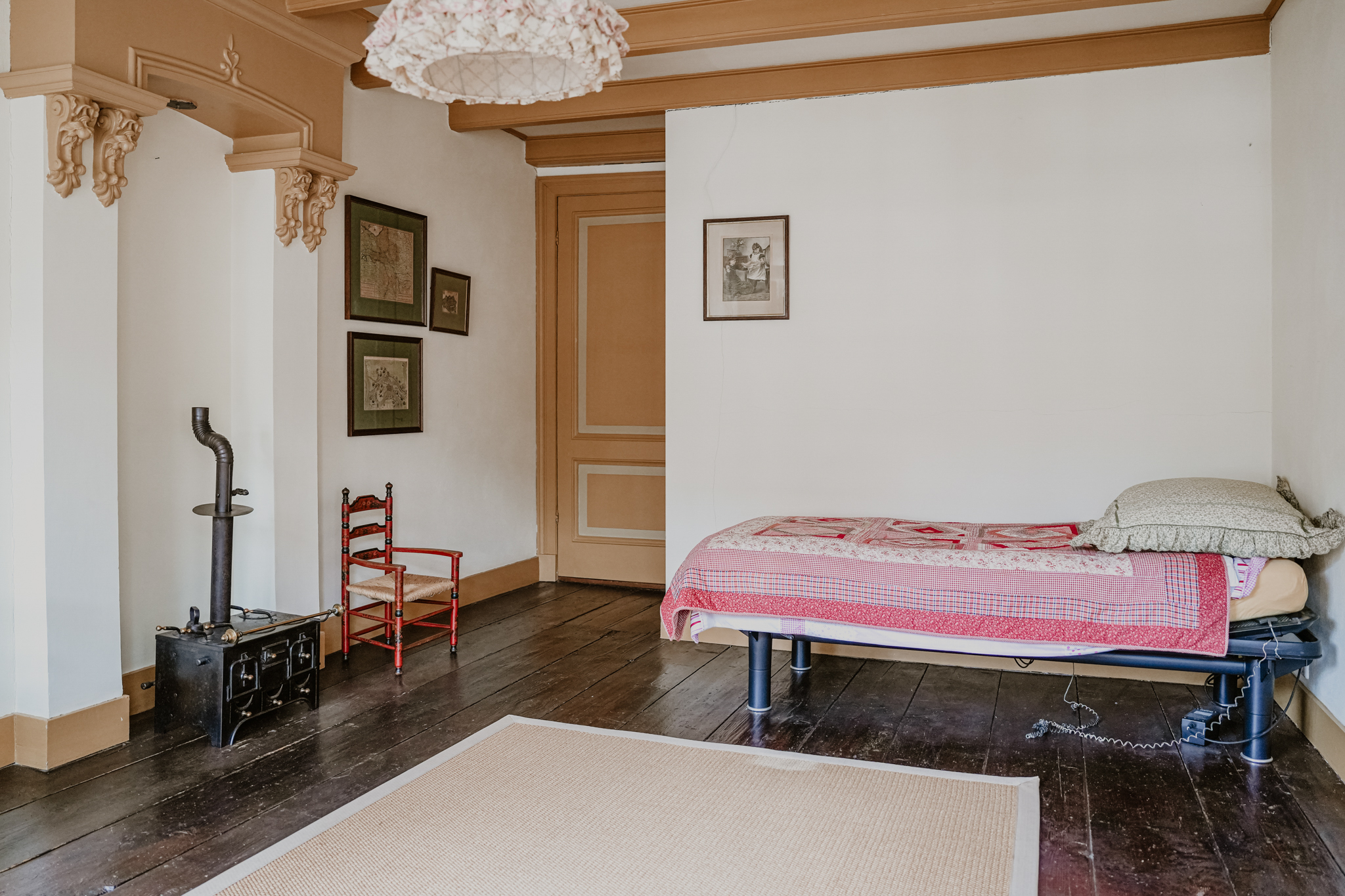 Op deze verdieping is de 16e-eeuwse sfeer voelbaar. Aan de voorzijde is een slaapkamer van 40m2 die in het verleden is gebruikt als woonkamer. Via drie 12-ruits schuifvensters is zicht op de brede Gasthuisstraat. Op de vloer liggen brede vloerdelen en er zijn twee vaste kasten. Aan de achterzijde is een nog imposantere slaapkamer. Er is een moer- en kinderbalkenplafond, een vloer met witgeschilderde brede vloerdelen en een kamerbrede kastenwand met fraaie paneeldeuren. Vanuit de twee 16-ruits vensters is zicht op de tuin.
