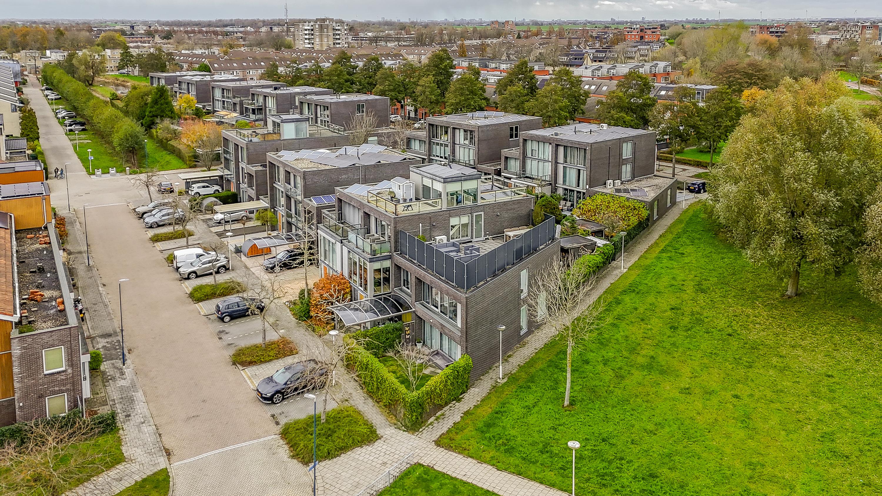 De buitenruimte is al net zo indrukwekkend: in totaal 168 m2 aan buitenruimte verdeeld over een ruime voortuin, achtertuin, 3 balkons en 3 dakterrassen. Hierdoor heb je altijd een plek in de zon én privacy. Op eigen terrein is ruimte om te parkeren onder de carport en er is zelfs een eigen laadpaal aanwezig. De ligging in een groene, rustige wijk van Zoetermeer maakt het woongenot compleet. Vanuit de woonkamer kijk je vrij uit over een groenstrook en volwassen bomen – een zeldzame combinatie van ruimte, privacy en natuur binnen handbereik.