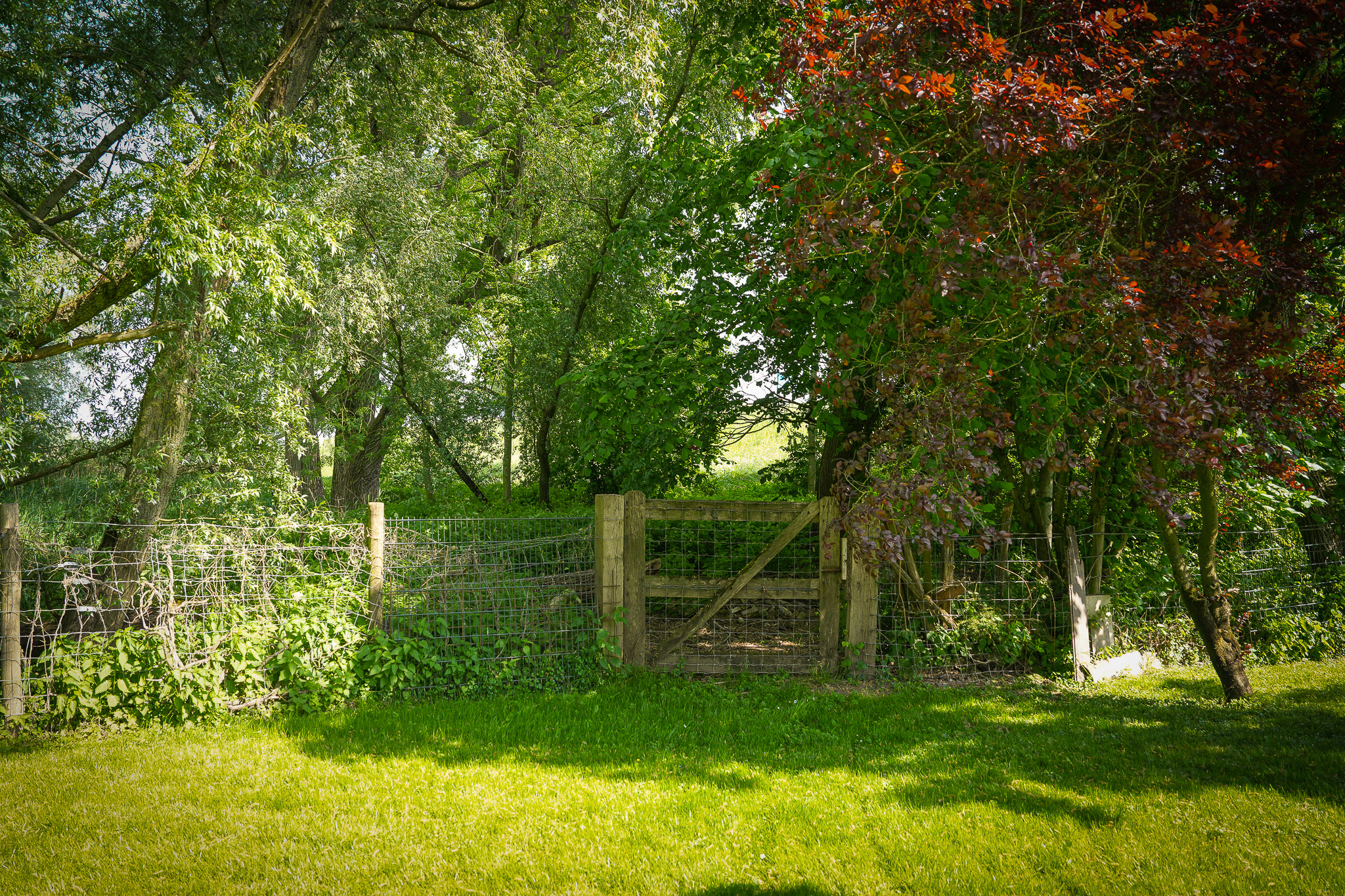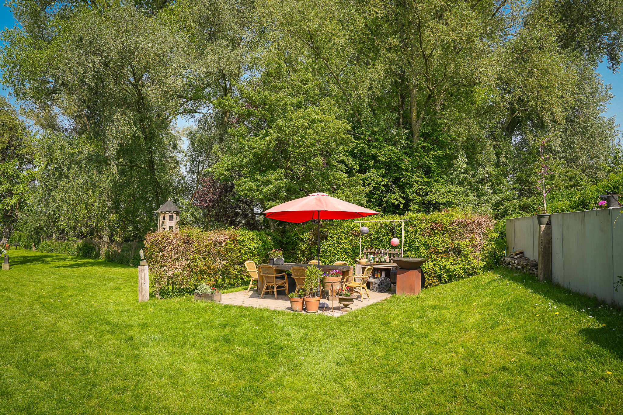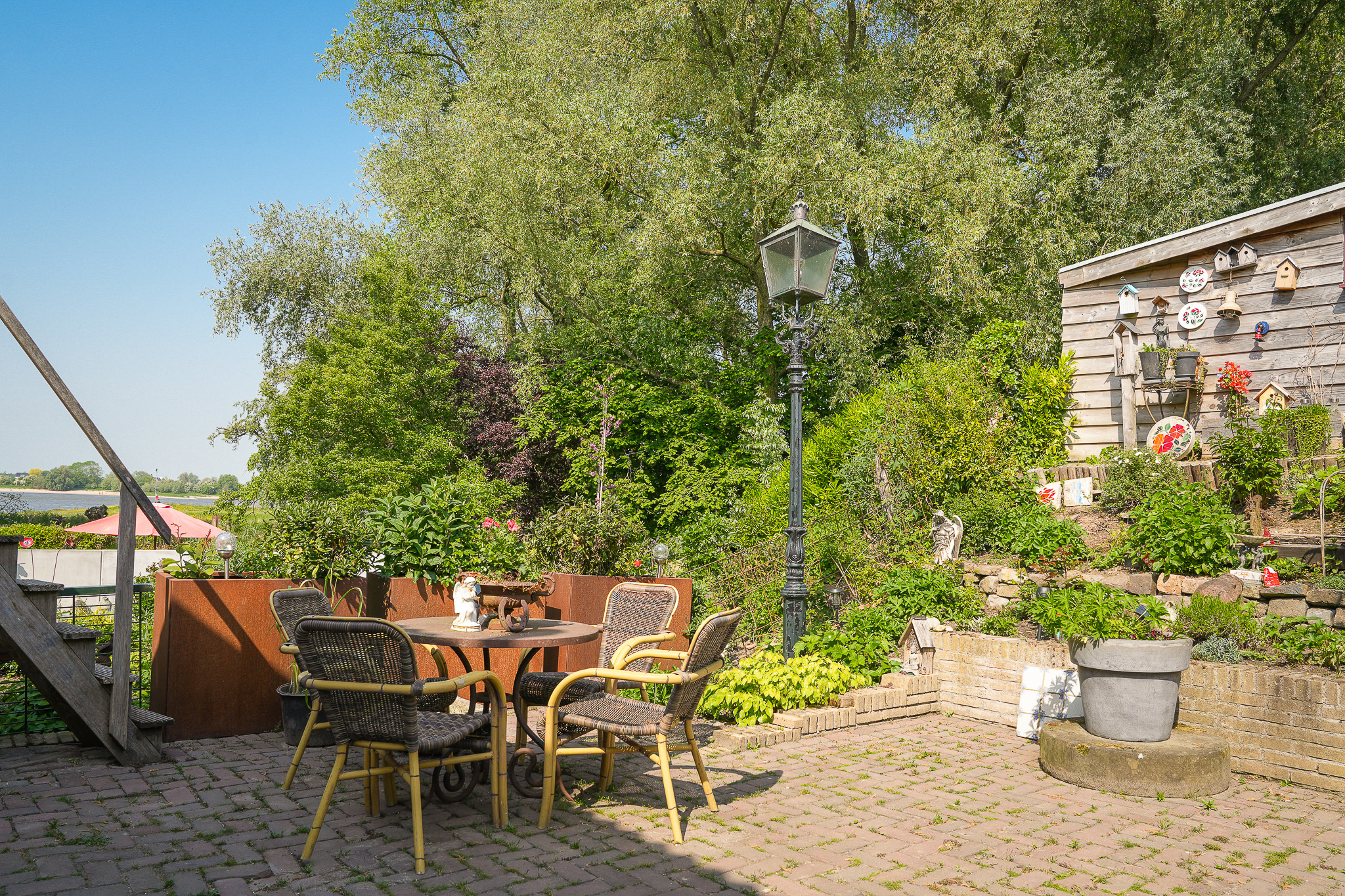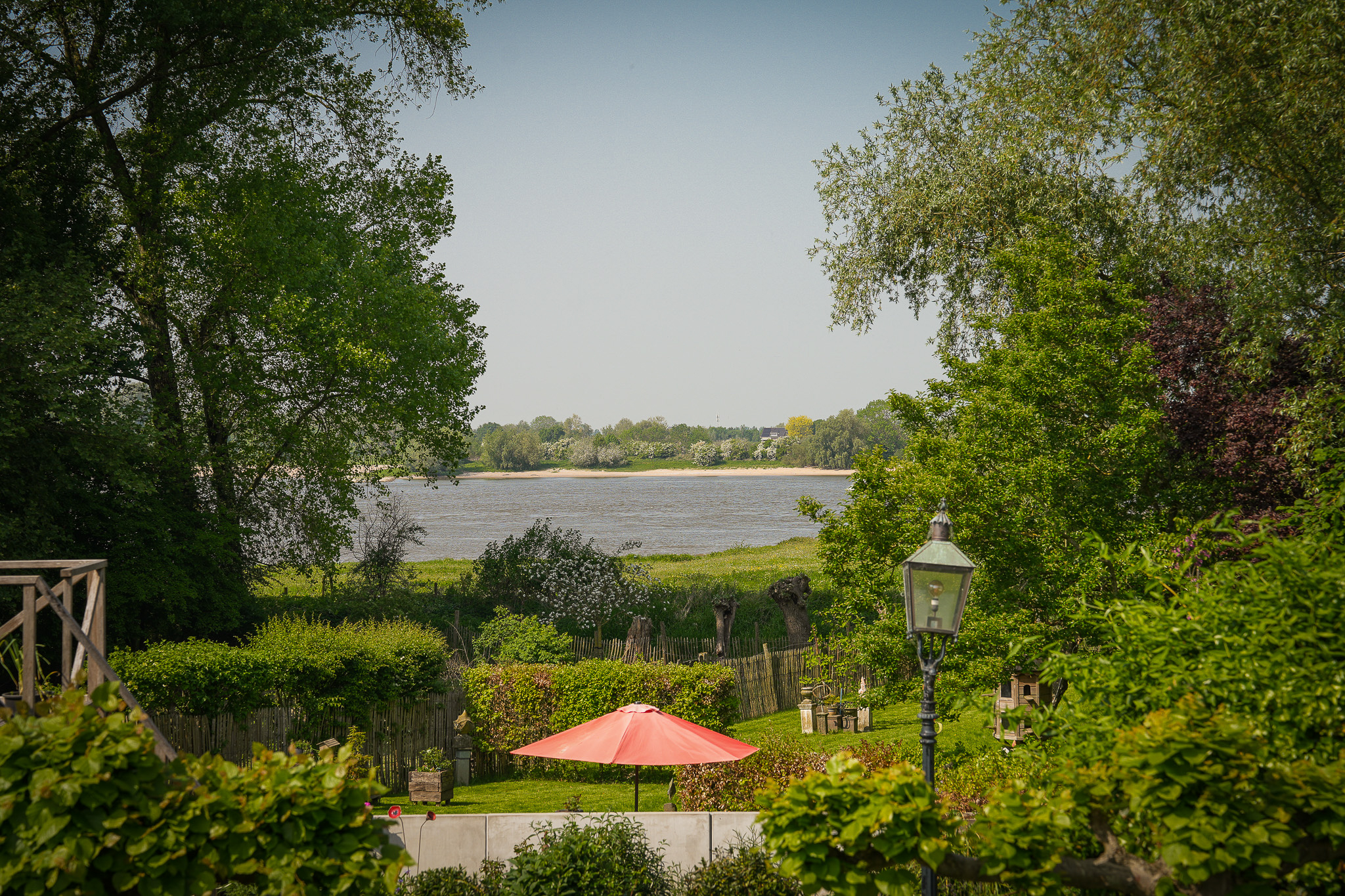 De tuin met diverse terrassen, houtopslag, mooie beukenhagen en een oude hoogstam fruitboom heeft een beplanting die bestand is tegen een hoge waterstand van de rivier mocht zich dit in de winter voordoen.