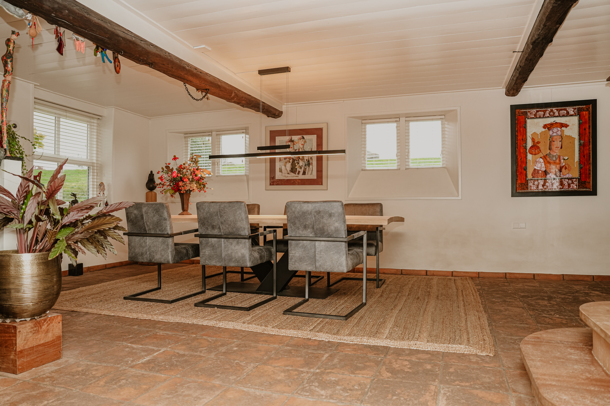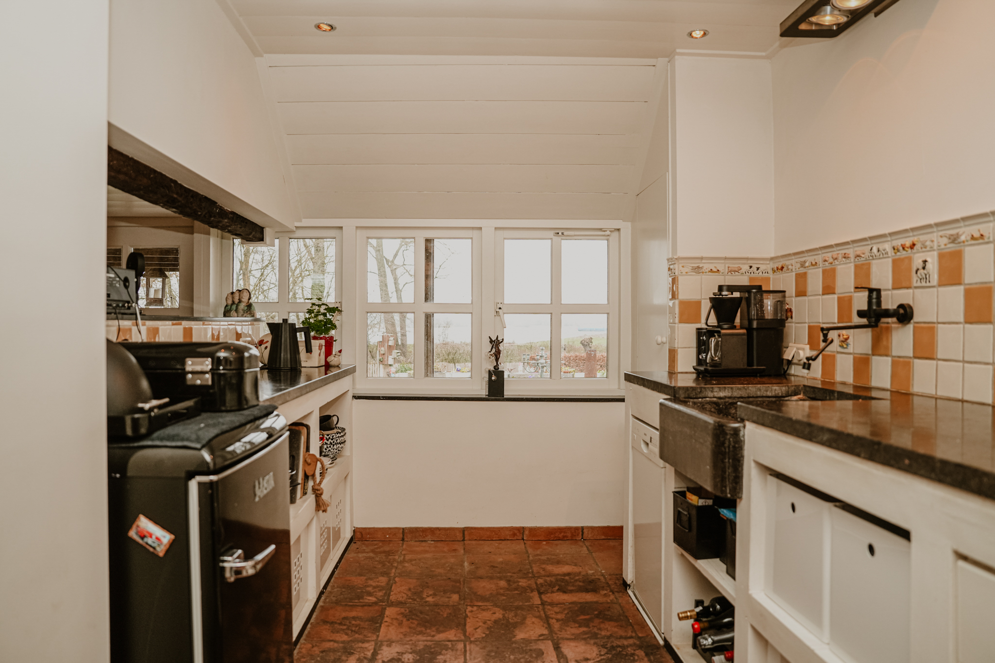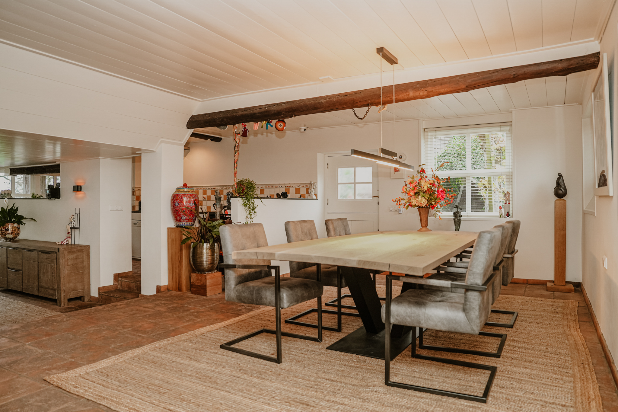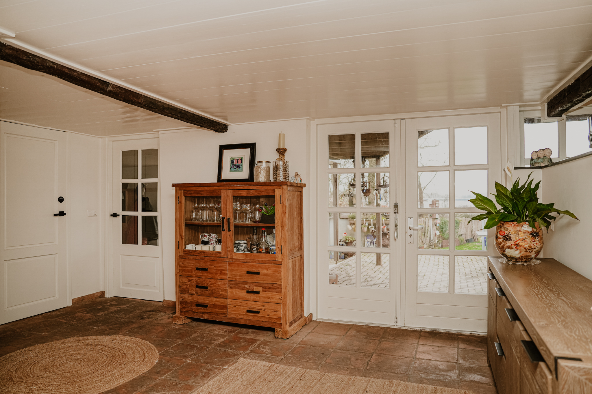 De entree via een gedeelde boerendeur aan de zijkant van het huis biedt direct toegang tot de grote woonkeuken. Aan de dijkzijde is een eetkamer op een verhoogd gedeelte. Deze eetkamer vormt een visuele eenheid met de ambachtelijk gemaakte keuken. De keuken heeft een fraai Belgisch hardstenen werkblad met een authentieke pompbak. Vanuit de woonkeuken is direct toegang tot het riviergerichte terras. Grenzend aan de eetkamer is een ruime bijkeuken met witgoedaansluitingen, waar ook de omvormer en de thuisbatterij hangt. Het lagere gedeelte biedt toegang tot de tuin-/werkkamer, een slaapkamer, toilet en een nieuwe (gasten)badkamer met inloopdouche en wastafelmeubel.