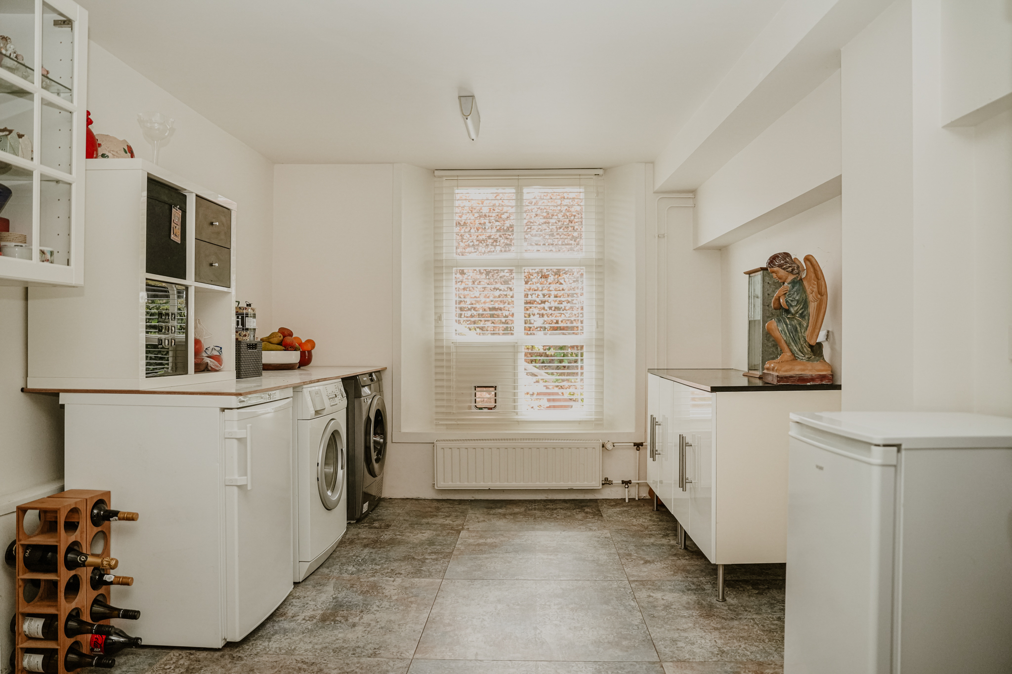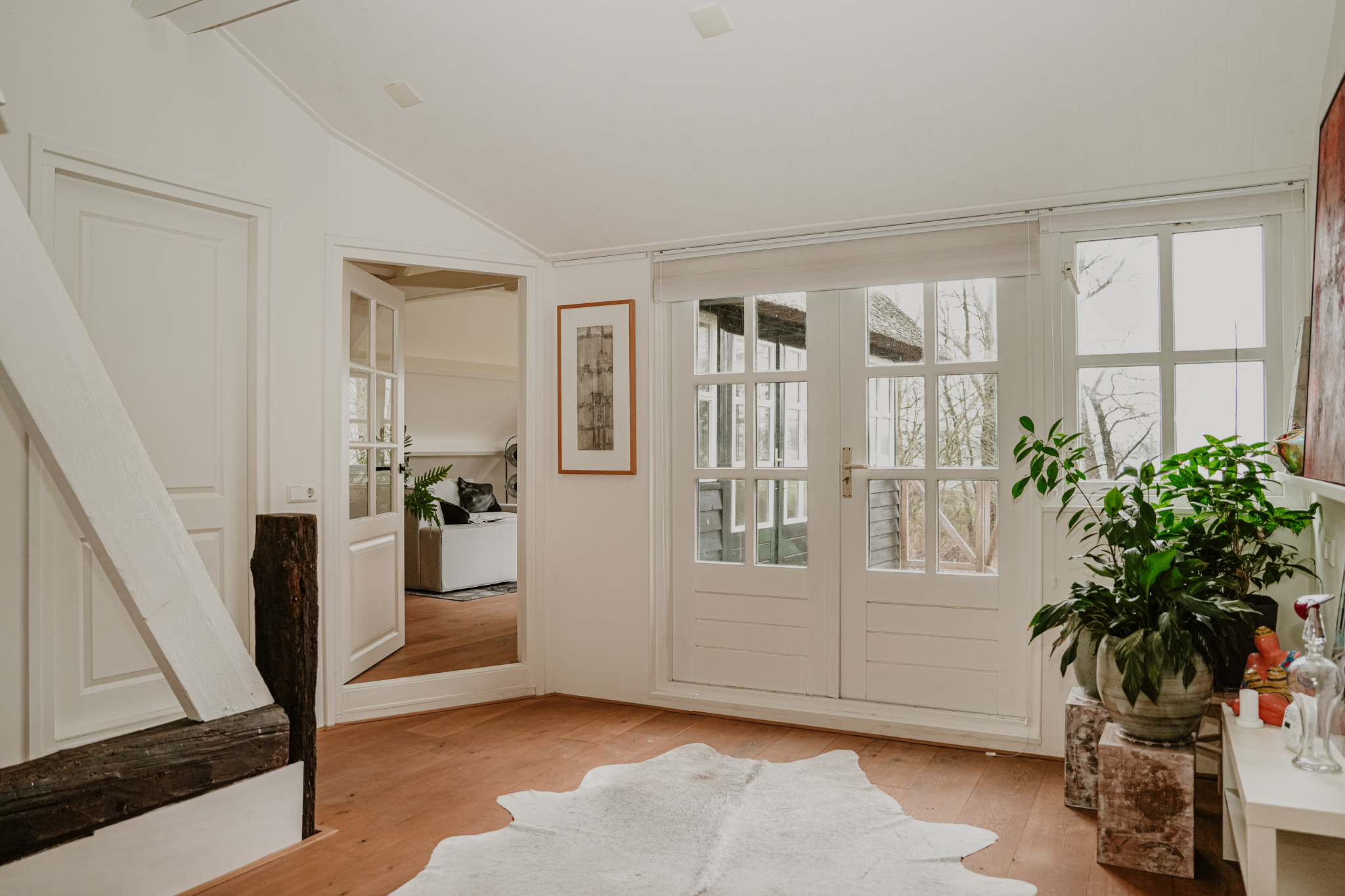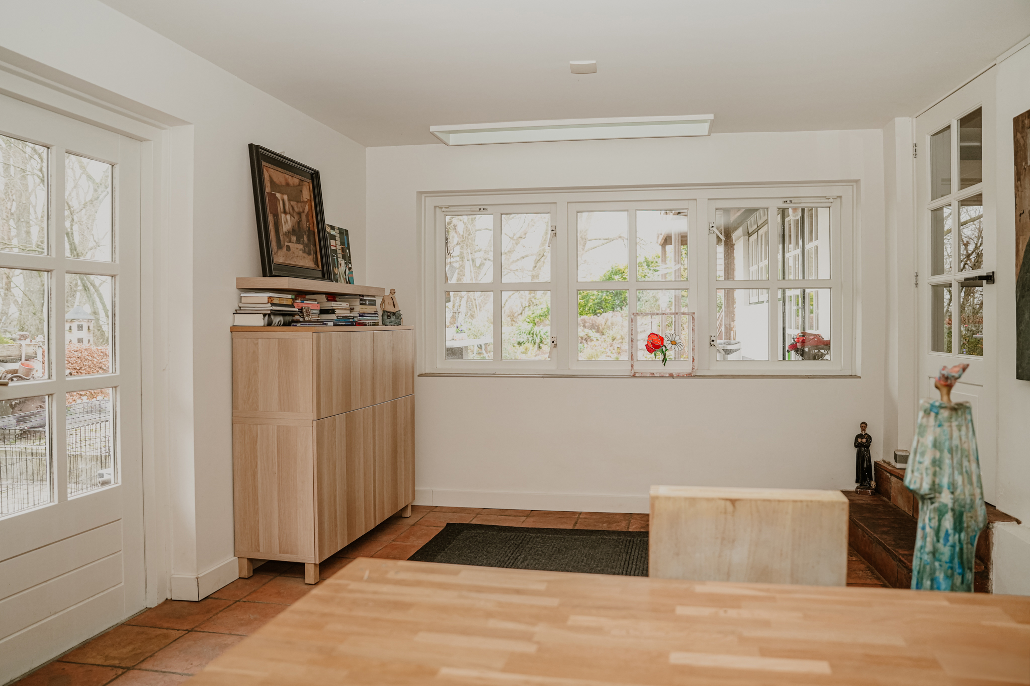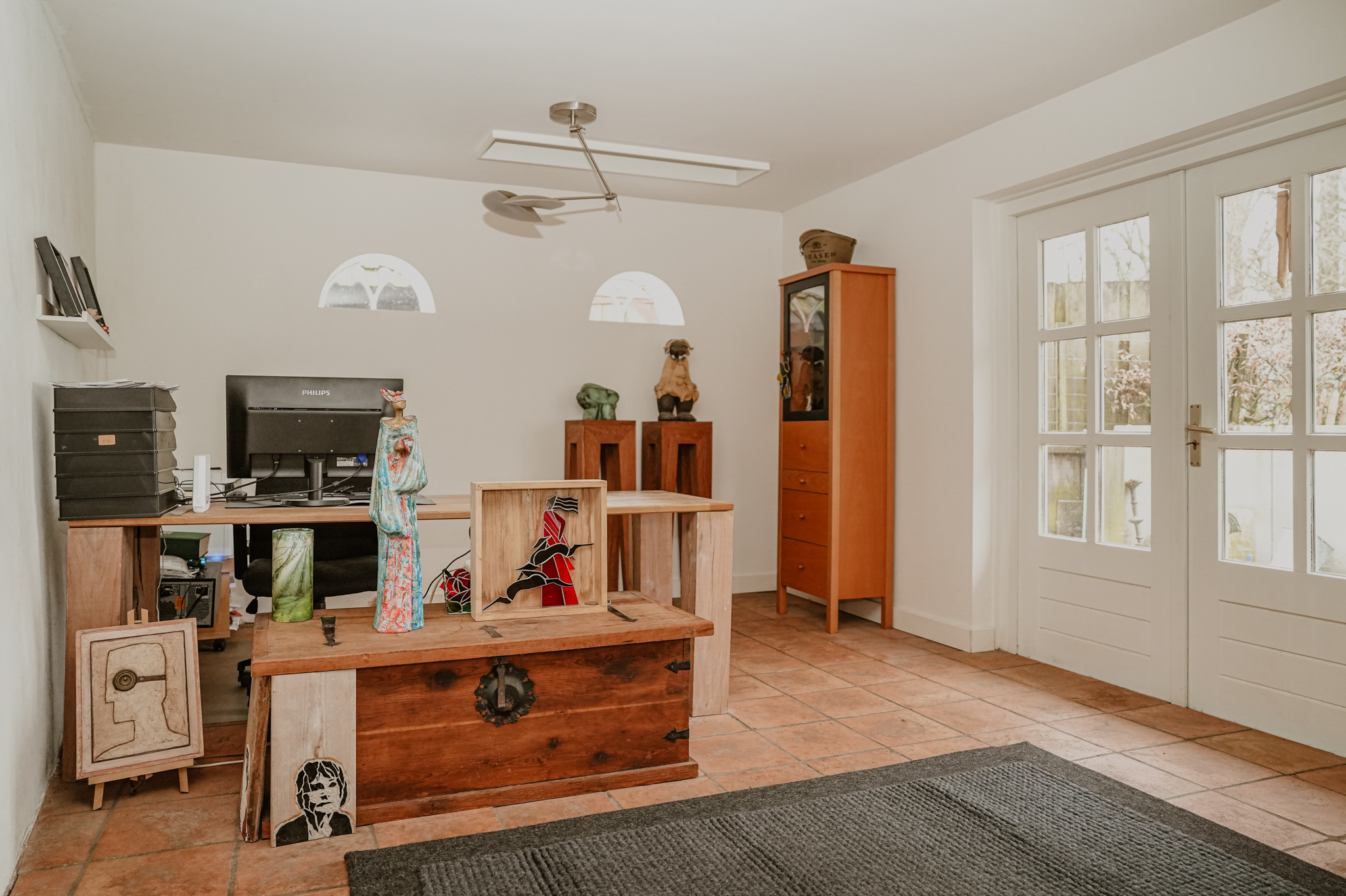 De tuinkamer bevindt zich in de uitbouw van het pand en heeft openslaande deuren met 6-ruitsroedeverdeling naar een tweede terras. De huidige eigenaar gebruikt deze ruimte als werkkamer, maar het kan ook een fijne tv- of speelkamer zijn. De vloer is grotendeels belegd met antieke rode abdijplavuizen voorzien van vloerverwarming.