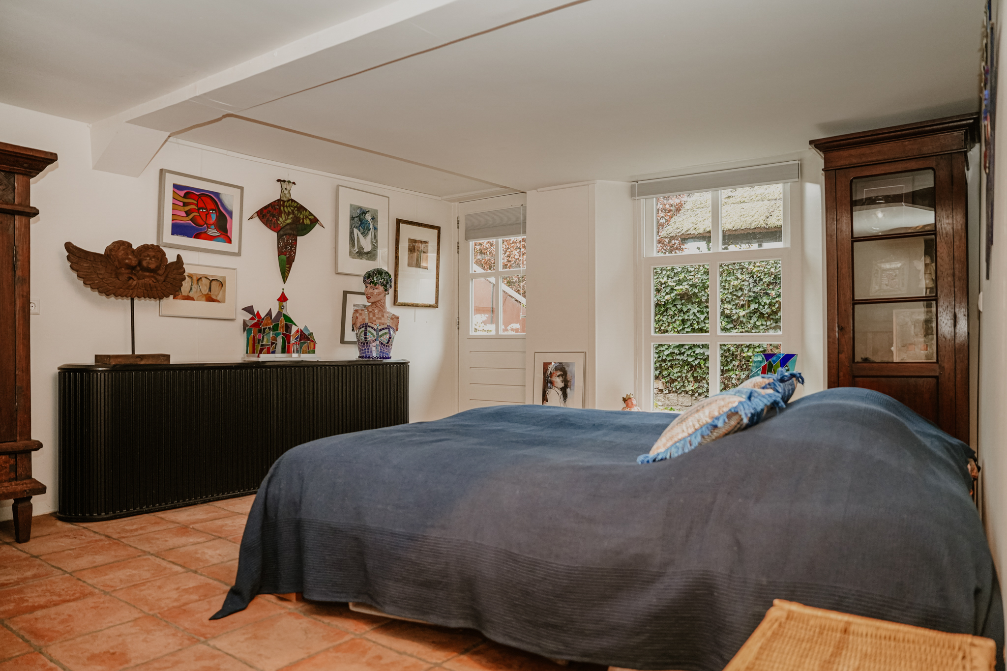 Doordat de slaapkamer een buitendeur heeft die toegankelijk is via een tweede dijktrap aan de westzijde van de woning, leent deze kamer zich ook als praktijk of gastenkamer.