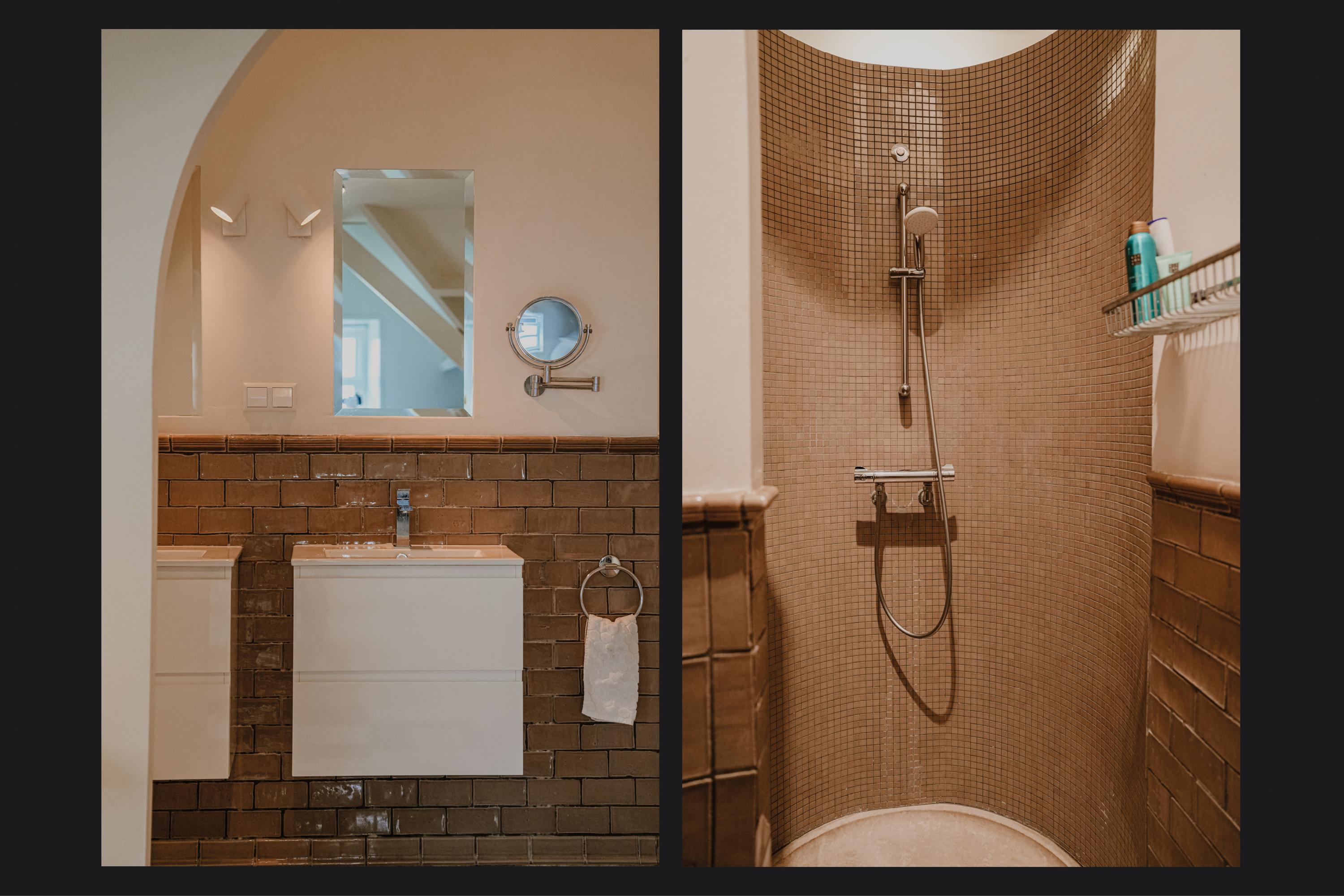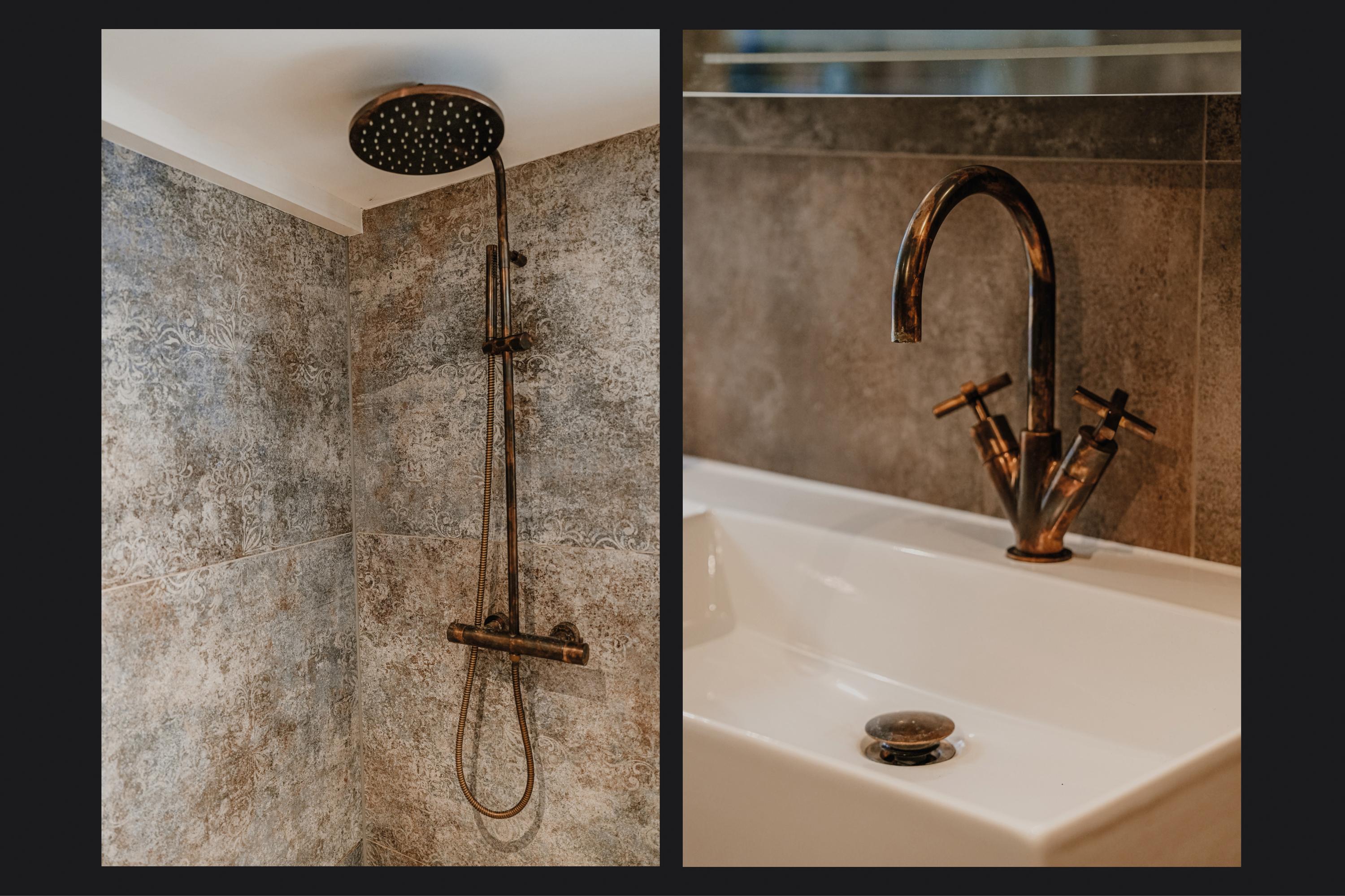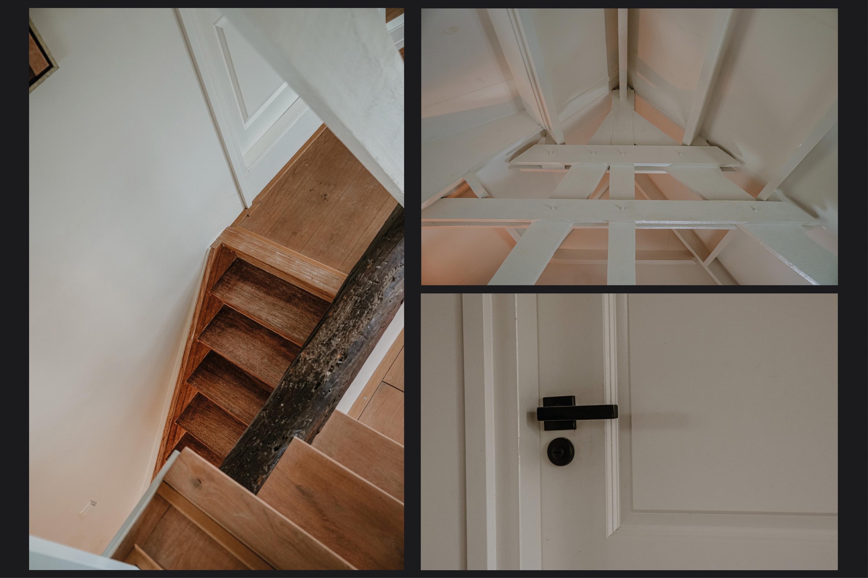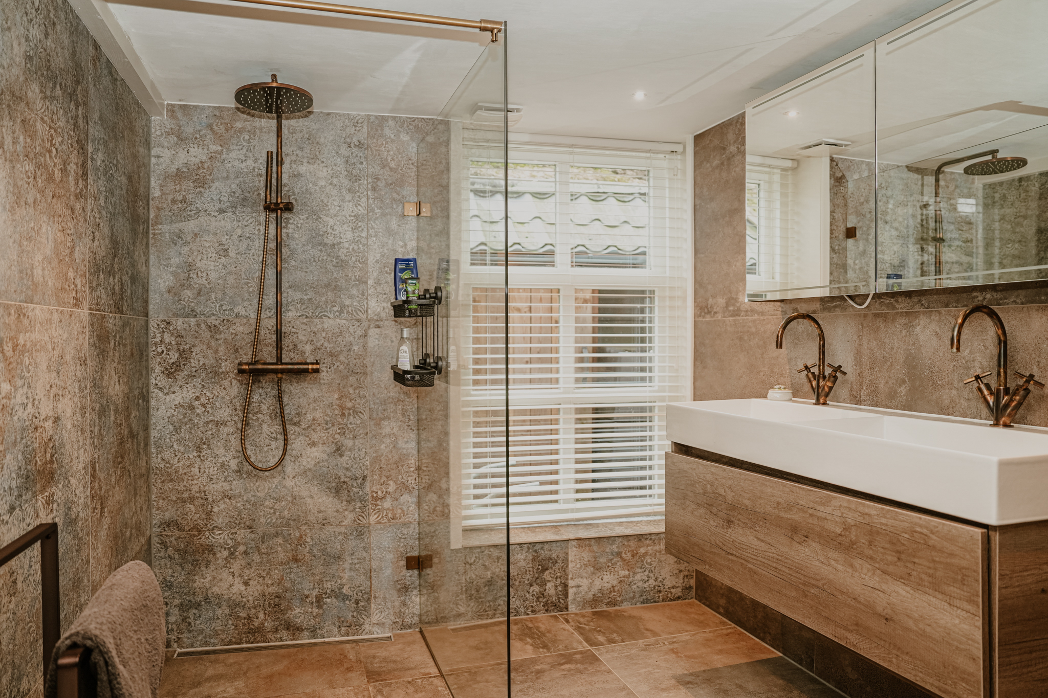 Op de verdieping liggen prachtige eiken vloerdelen. Aan de westzijde van het oorspronkelijke dijkhuis bevindt zich een riante slaapkamer met kleedkamer en de 2e badkamer. Deze badkamer is speels ingedeeld met een inloopdouche, toilet en dubbele wastafel en heeft een natuurstenen vloer.