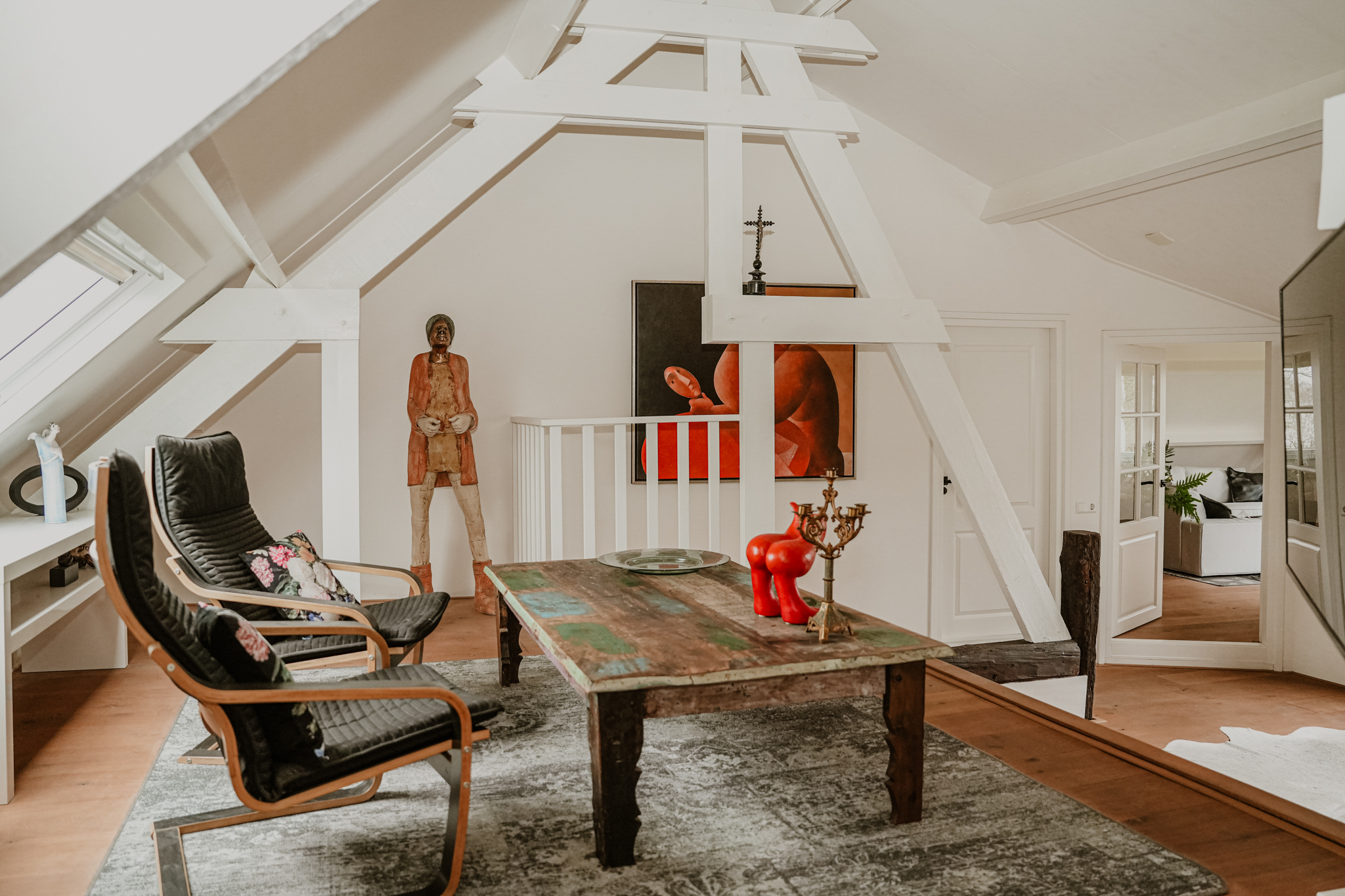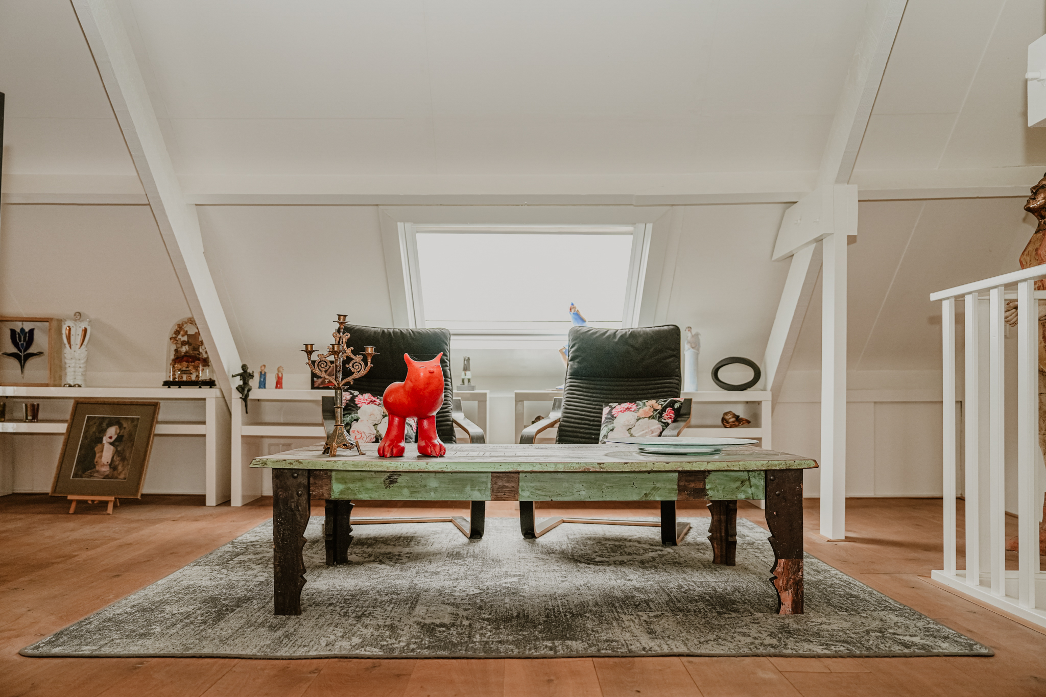 Bovengekomen is het één grote verrassing. Er is een zee van ruimte met veel licht en een geweldig uitzicht. De ruimte in het oorspronkelijke dijkhuis is ingericht als werk/lounge-ruimte, waarbij de nok in het zicht is gebleven. Vanuit deze ruimte geven openslaande deuren met 6-ruitsroedeverdeling toegang tot het riviergerichte dakterras. Aan de achterzijde, in de uitbouw uit 2003, bevindt zich een tweede woonruimte met eveneens openslaande deuren en veel ramen. Ook hier is een prachtig zicht over de rivier de Waal. Deze inspirerende ruimte leent zich bij uitstek als atelier of als extra slaapkamer.