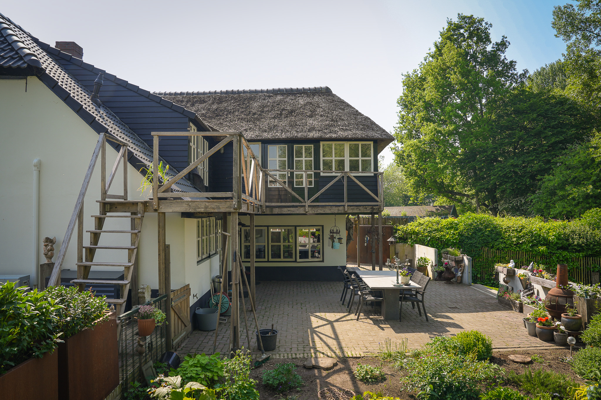 Tuingerichte woonkeuken met verhoogd eetgedeelte, tuin-/werkkamer, slaapkamer, luxe badkamer, toilet en een grote bijkeuken op de begane grond.